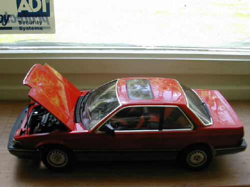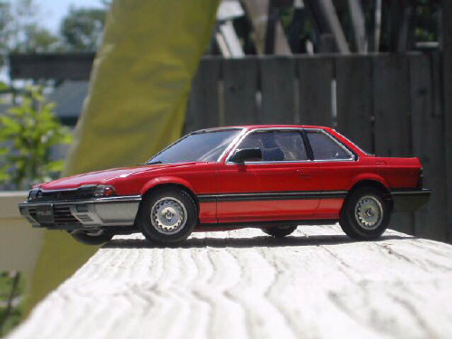 I bought this kit off ebay. It's a Tamiya Honda Prelude XX and it was built box stock. I used Bare metal foil instead of Chrome silver (X-11) for the metal molding around the windows and the side trim. The body was painted with Diplicolor Automotive paint spray followed by Testors Clear. Some of the engine details were accomplished by dry-brushing silver onto a semi-gloss black base. I also glued some black insulation on the underside of the hood which I purchased from Model Car Garage. Overall the kit went together with no major problems. There was a slight fit problem when trying to match up the front bumper with the left fender, but that was easily remedied with some sanding and shaving of excess plastic. The kit comes with complete engine detail and movable headlights. It was a pleasure to put together.