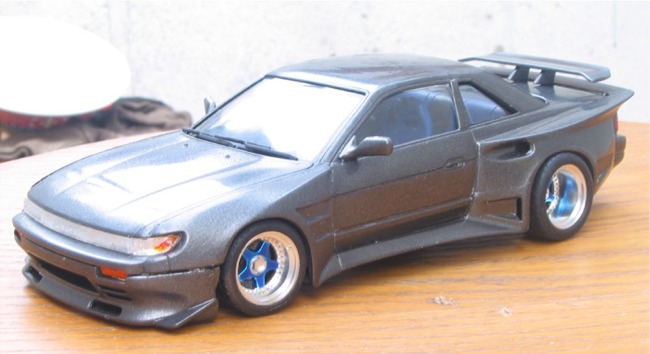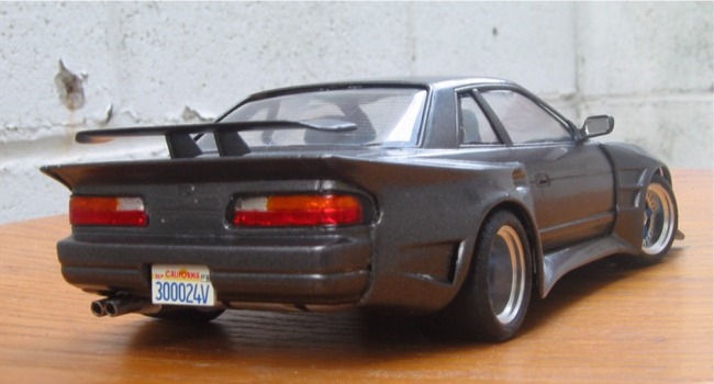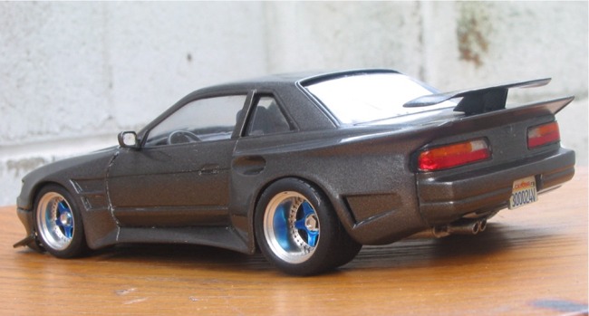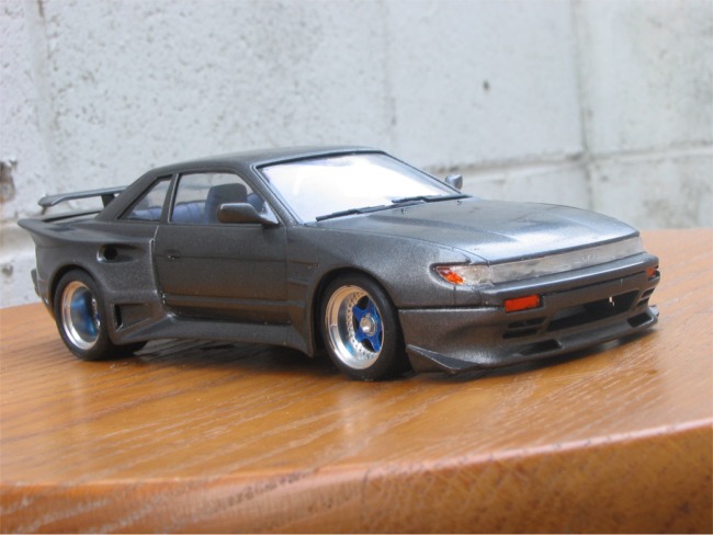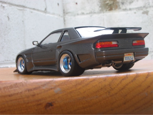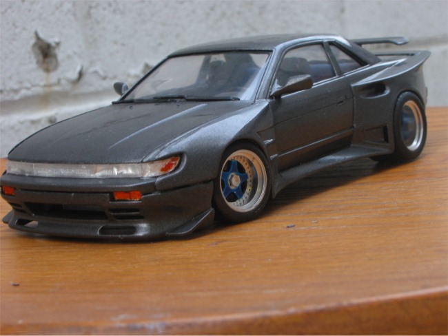 This is Fujimi's Silvia K's (S13) as tuned by 345 Tuning. The bodykit came molded with the kit as separate styrene parts. The rear wheels are 345/35/15 if anyone's interested. Body was sprayed Graphite Gray by Duplicolor, baked for two days under a halogen light, and then