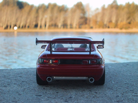 This is a Fujimi kit of the SW20 MR2 turbo. It went together without any major fusses and is a good fun build out of the box. This kit is my first ever custom model. The front bodykit was constructed by using the original rear spoiler chopped in half, glued onto the bumper and blended in with putty and lots of sanding. The rear GT wing was scratchbuilt. The sideskirts are styrene sheet and the exhausts are aluminum tubing. The model was painted with grey primer and Maranello Red basecoat from duplicolor, then top coated with tamiya italian red. It was then rubbed out with toothpaste and polished with kitten liquid polishing wax. Panel lines done with a .05 art pen. The Red Devil later received improved GT wing stays.