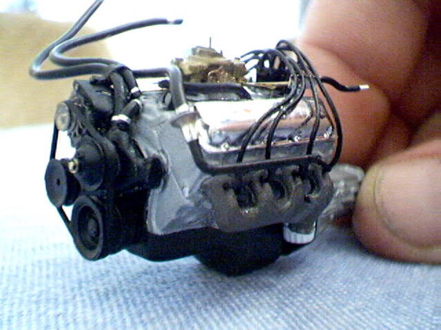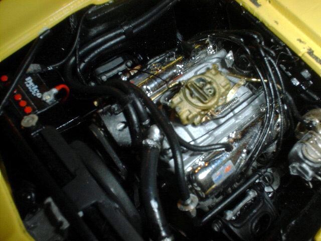 While this car used the same Revell base kits and Model Car Garage detail kit as the other car, I took this one a little further. Not satisfied with the finish of the photo-etch I polished it and then chrome-plated it with nickel silver. The results were fantastic!! The body used Vari-prime for the primer and I tried Metro Paints for the paint this time, fantastic! The engine as it comes in the kit has 19 parts. I added no less than 92 separate parts to the engine including a full and authetic smog-pump set-up, complete plumbing and wiring, hand bent aluminum brackets for all of the accessories, a carburator detailed with photo-etched linkages and pumps, home-made turned aluminum pulleys and distributor base, spark plugs, plug wires with correct boots, a functional dipstick, machined diverter valves, scratchbuilt wire looms, and straps for the heater hoses. The valve covers were thinned and sent to Little Motor Kar for rechroming along with other parts and the water pump was drastically altered for correct appearance and to handle the strain of a real rubber V-belt. The interior was fully replicated down to the photo-reduced dash gauges as well as the aftermarket gauges hanging from under the dash. There is also a photo-reduced copy of one of the magazines the real car was featured in on the passenger seat. The side windows were added and the chassis took some adjusting for proper stance and wheel location in the wheel wells. Additional decals from Slixx, Gopher details, Kieth Marks, and The Last Detail finish off the model. It competed once and swept the show with every award except Best Engine (My pal Doug beat me with a Top Fueler engine!)