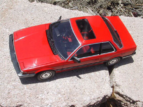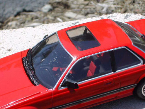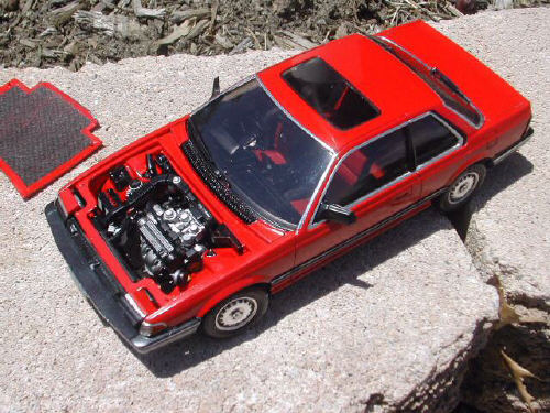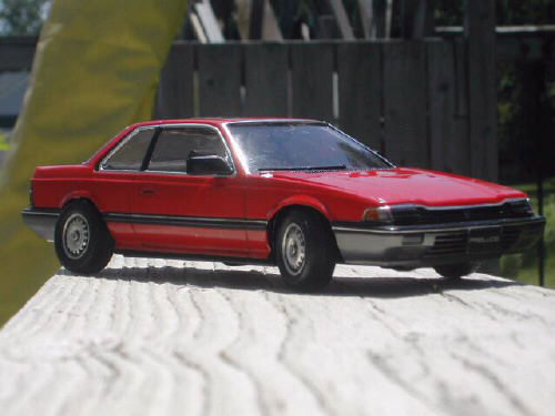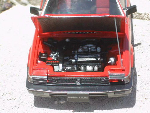 I bought this kit off ebay. It's a Tamiya Honda Prelude XX and it was built box stock. I used Bare metal foil instead of Chrome silver (X-11) for the metal molding around the windows and the side trim. The body was painted with Diplicolor Automotive paint spray followed by Testors Clear. Some of the engine details were accomplished by dry-brushing silver onto a semi-gloss black base. I also glued some black insulation on the underside of the hood which I purchased from Model Car Garage. Overall the kit went together with no major problems. There was a slight fit problem when trying to match up the front bumper with the left fender, but that was easily remedied with some sanding and shaving of excess plastic. The kit comes with complete engine detail and movable headlights. It was a pleasure to put together.