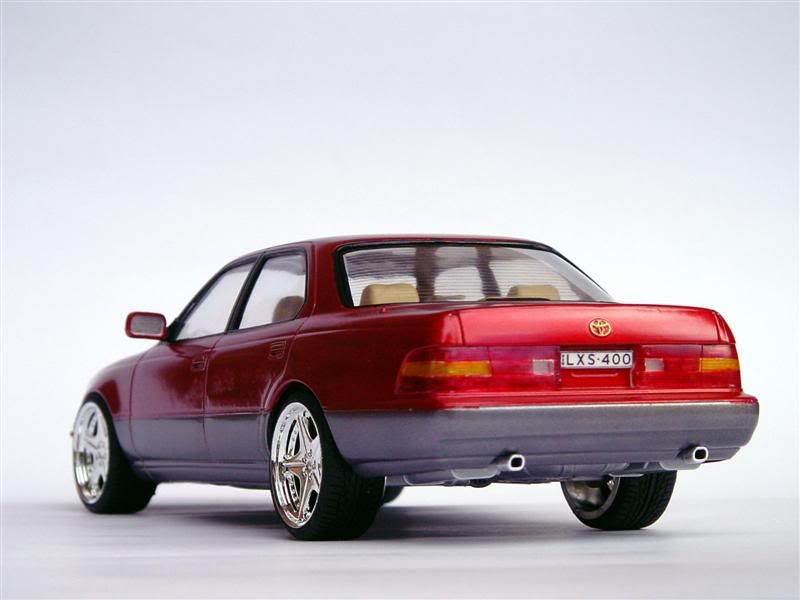 Here is my version of the Fujimi kit (03218) of the Lexus Celsior, or LS400 as it was known in Australia. I saw this kit for $10 and could not resist. Paint is Mica Red over Light Gun Metal, wheels are Aoshima 20" Leon Hardiritt Ordens. Very simple kit, but good fun, and I am happy with the result.