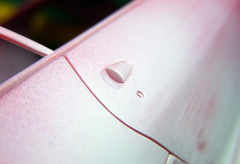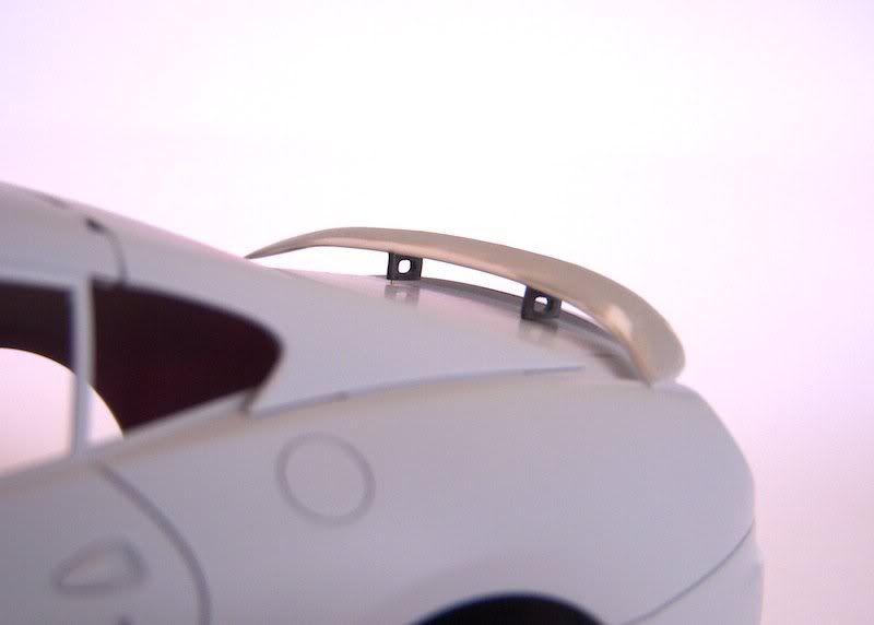 the spoiler bracket is made from leftover sprue runner, as i felt the styrene sheet that i had is too soft, first i drill holes, then slowly sand to get the right shape, then i cut it out and slowly sand to get the correct size and fitting, very difficult to get everything glue symmetrically if there's a slight dislocation, as you can see, the position i glue is not centralise and slightly towards the right side.