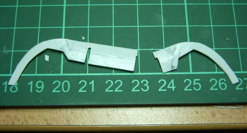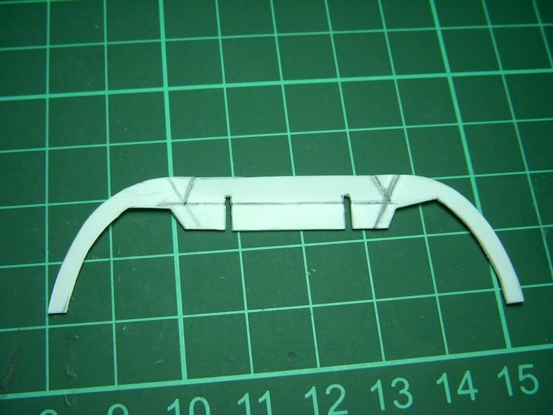 the rear lips, first trace the shape from the rear diffuser, then cut out from 0.5mm styrene, i draw line to mark the bending line