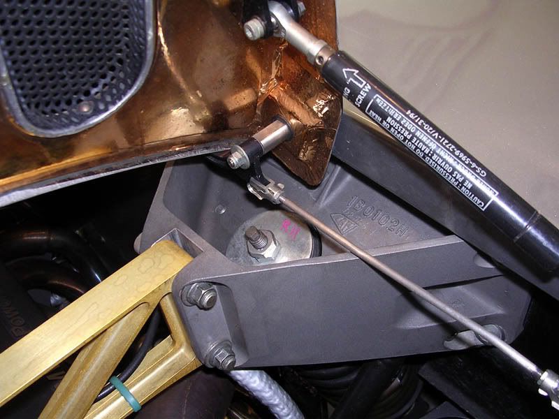 To make it more clear, see the arrows in these images below. The red arrows in the first image point to the little rollers that the upper engine cover presses down on to lock the rear cover. They are spring loaded and so they release automatically when the upper engine cover is raised. In the second image the red arrows show the pivot point for those little arms with the rollers. You can then follow the small metal rod forward to the actual locking mechanism which is marked with the blue arrows. The green arrows on the engine cover are pointing at the catches that hold the rear cover closed. I added two more photos from Mr Hurst that happened to show a more detailed shot of the roller/arm and metal rod for the locking mechanism.