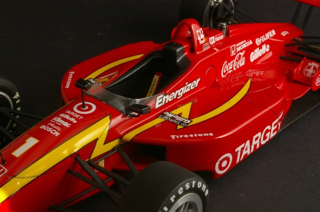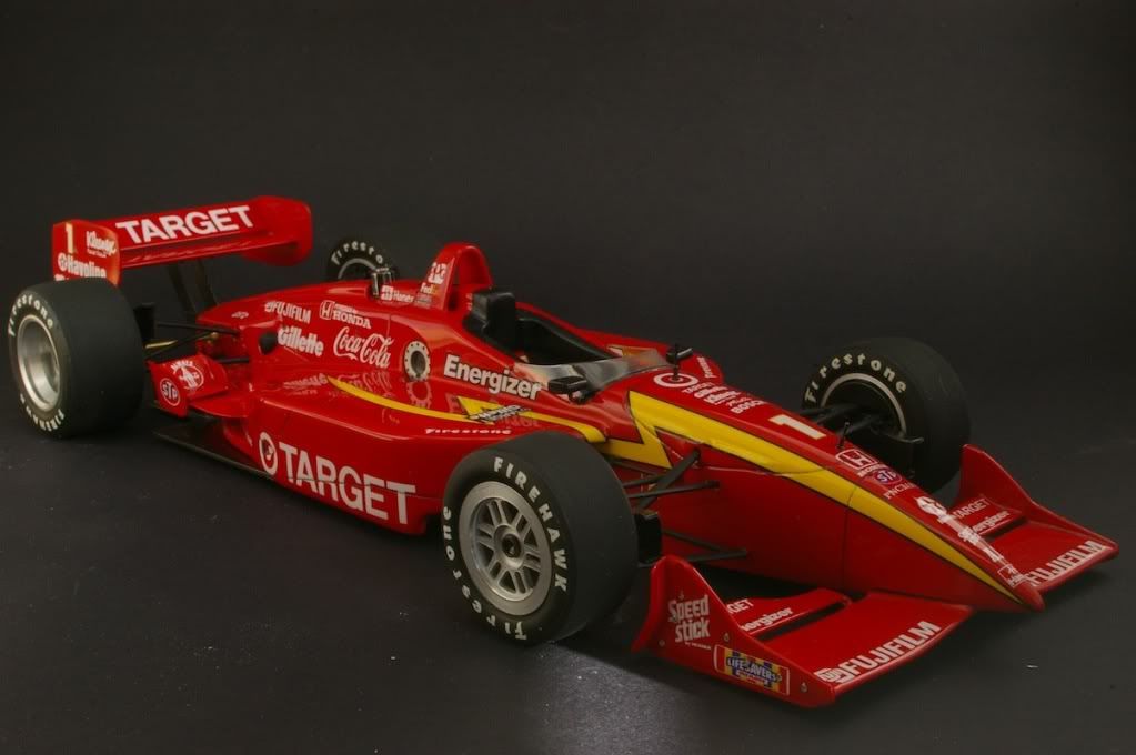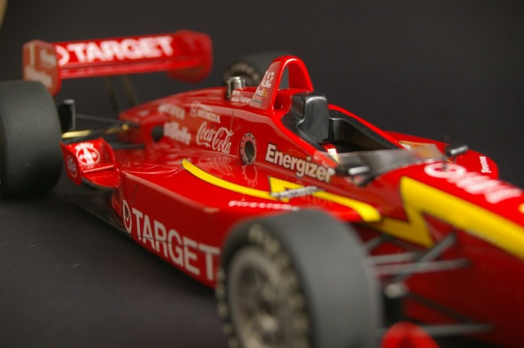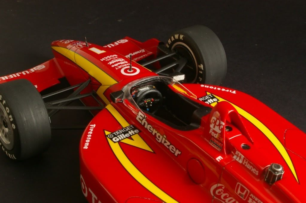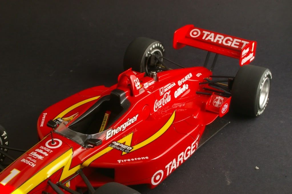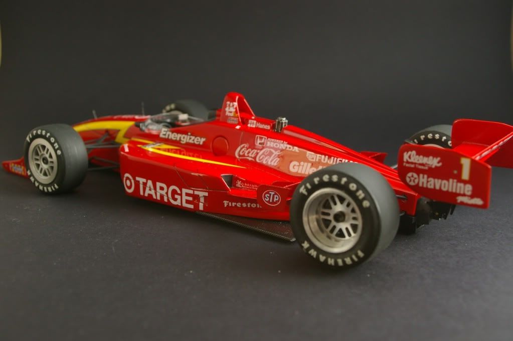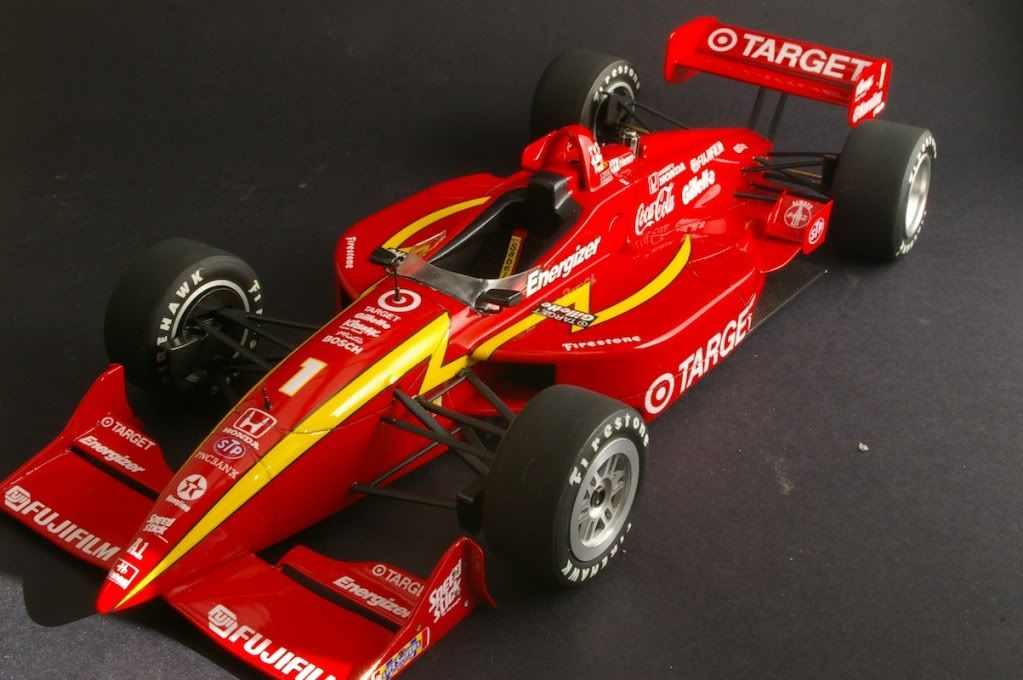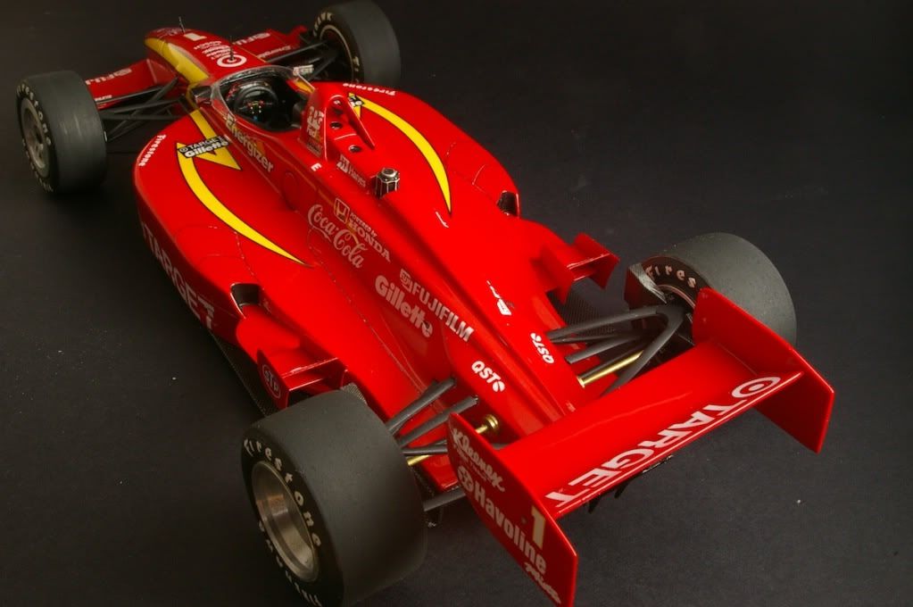 Just finished - larger than the 1/20 F1 kits, so hard to fit in the photo booth =) Suspension is from the Tamiya Lola kit, paint is TS8. Tyres also from the Tamiya kit.