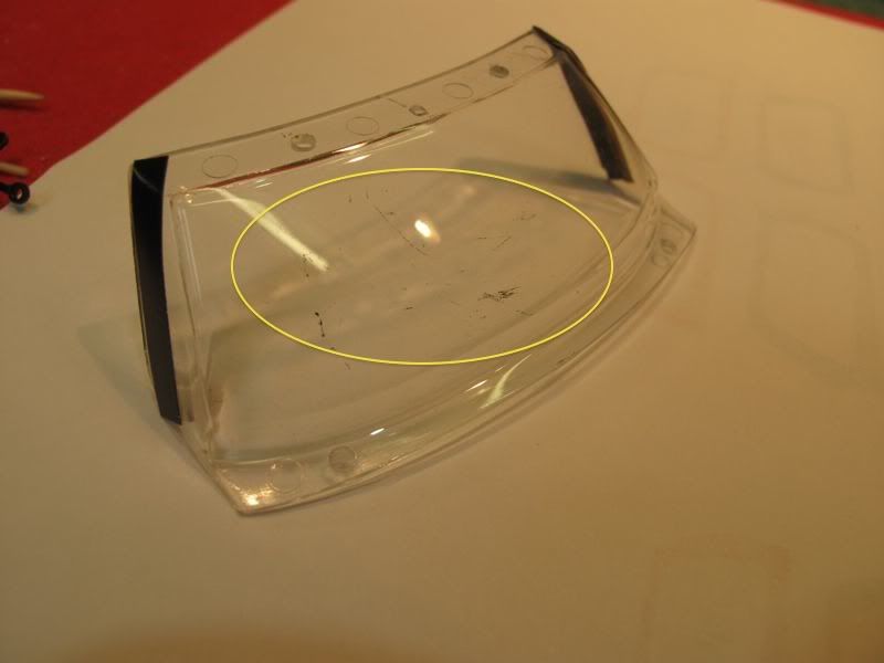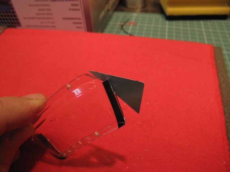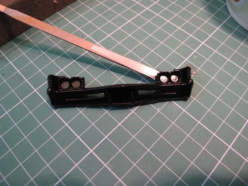 The movie car has searchlights attached to the A-posts. These were included in the resin transkit but with no clear parts. I made some out of punched discs of clear plastic (collar stiffener from when I unpacked a new shirt)