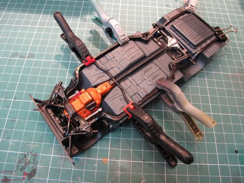 Rear bumper glued in place. This was tough! Paint and clear coat has added thickness to make an already poor fitting part now a VERY poor fitting part. I had to use so much manhandling that I have rubbed the Alcald off in a lot of places it had to be masked off and re-painted.