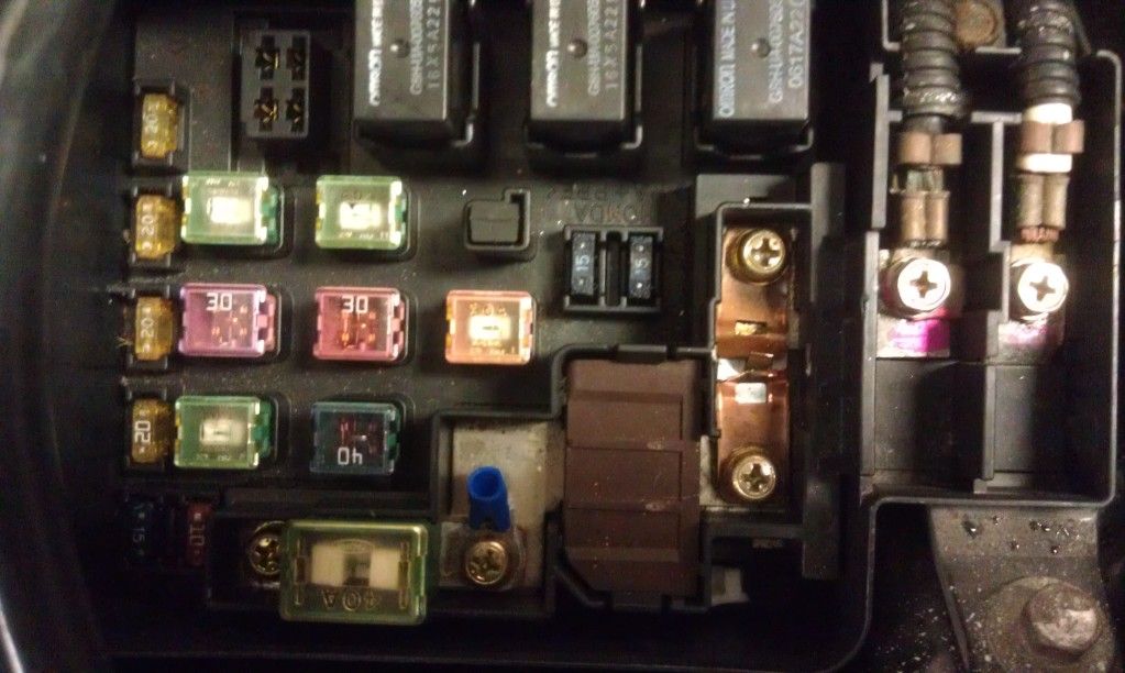 You can see the copper where the 80A fuse should have been in the center right side. The two 30A fuses in there now are the 2 that were replaced. The kid came by and took the old fuses with him for some reason. The relay that's missing in the top left corner is for his blower motor. I'm guessing he's going to want to install a new one if he plans to drive it some time soon. He didn't seem one bit concerned about any of this. We're leaving things the way they are.