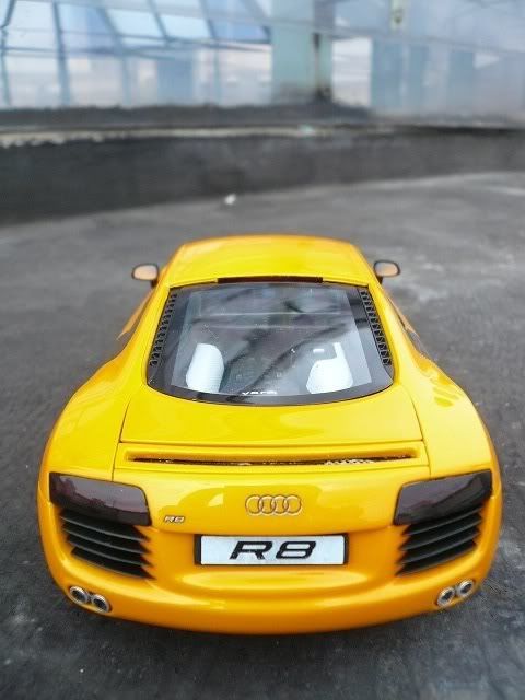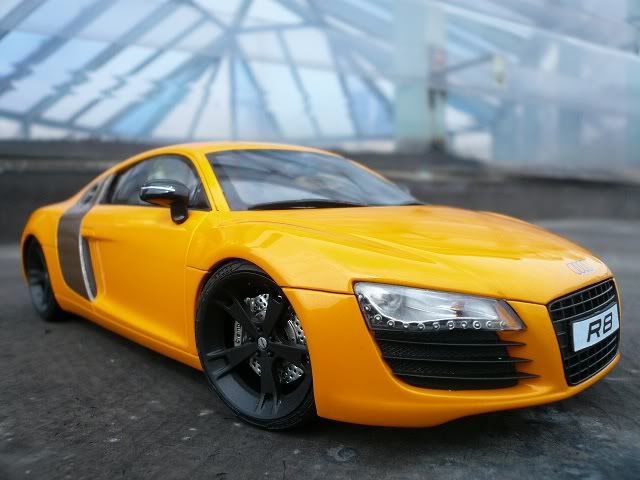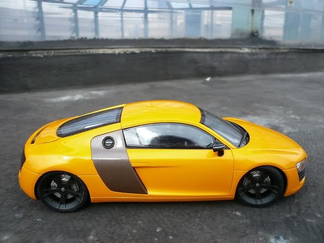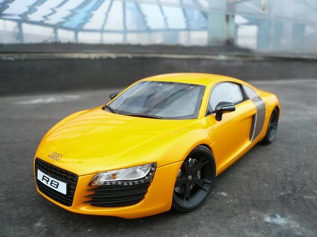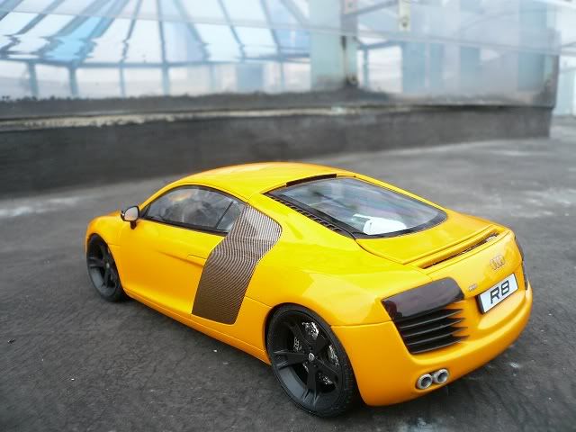 very nice lookin R8. quick question, I plan on doing one of these in the future, but the fins on the front and rear bumpers... are those connected or separate? if they're one piece, how did you get such a crisp paint line? looks a little difficult getting tape in there.