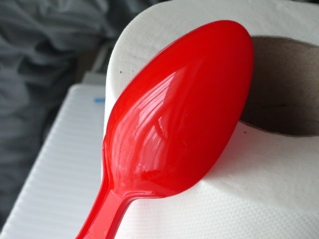Just as a hint. These are plastic test spoons, primed and painted TS-49 Bright Red. Straight from the can with no polishing whatsoever. The reflection is the net curtain at the window. This is where I would be at before I go to the compounds. Just saves a lot of compounding if you get the paint application as good as can be from the can...