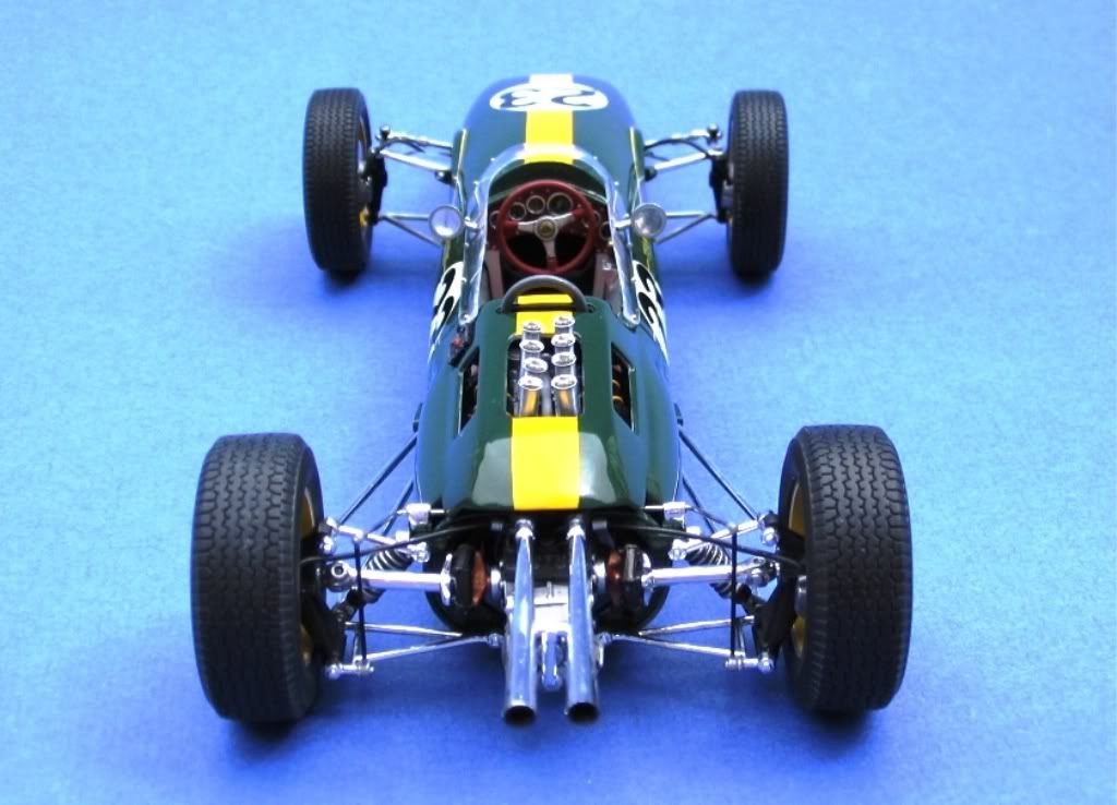 Here are a few pics of my Lotus 25. Scratch built intake trumpets, rear sway bar, added ignition wires, removed yellow Dunlop from tires.