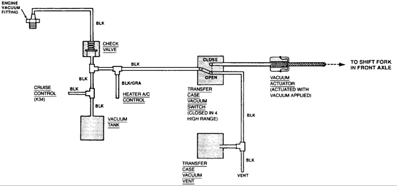 Just as a update. I smoked the system today. And so far i found a bad vacuum hose connection at the vacuum tank. And found a pin size hole in the vacuum actuator under the battery. Replaced the actuator and the hose and problem still present. Noticed that the cable running down to the front diff is kinda hard to push and pull. I have an extra cable I'm going to try. And upon further inspection the vacuum diagram above isn't exactly how mine is set up. I have an electric cruise control motor. On the hose from the intake i have a check valve and there are two outlets from the valve. One goes to the tank on the hood and the other runs down and then splits again and one hose runs into the firewall on the drivers side, I'm guessing for the HVAC doors, and the other runs back behind the motor down to the transfer case from what it looks like. I can clamp off the hose running down to the transfer case and my vents will still switch to defrost. So that tells me the problem isn't below.