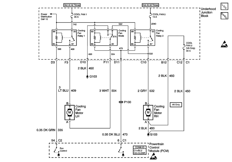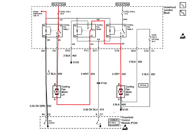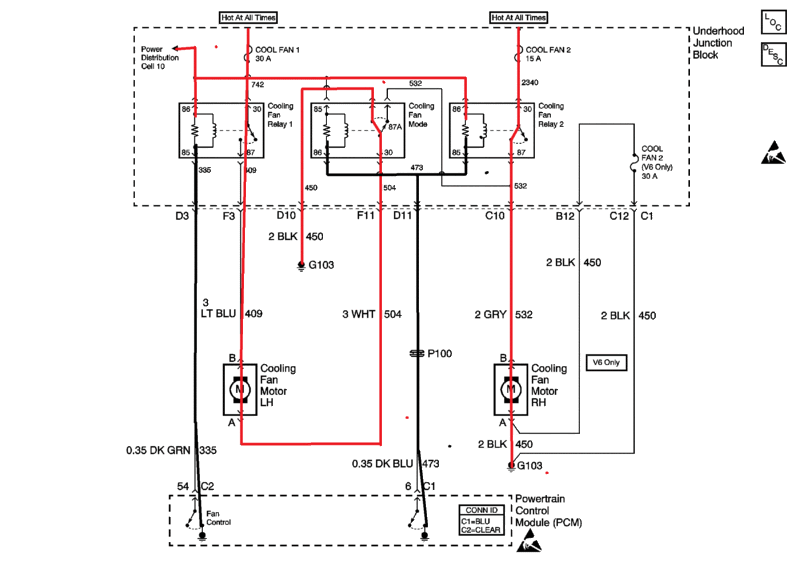 If the left fan runs on low speed so sould the right fan. PCM grounds fan control ckt., closing relay 1. (any time fans are needed relay 1 is grounded and closed) Power comes from Cool Fan 1 fuse, through Relay 1, the L/H fan motor, up through the normally closed contacts (87A) of the mode relay, down to splice into ckt 532, through R/H fan motor to G103. They run series, 6 volts each, half speed. The Mode relay and Relay 2 are not commanded on until high speed is needed, isolating the L/H and R/H fans to each run on their own full 12 volts. With a cold start engine and A/C off, neither fan should be running.