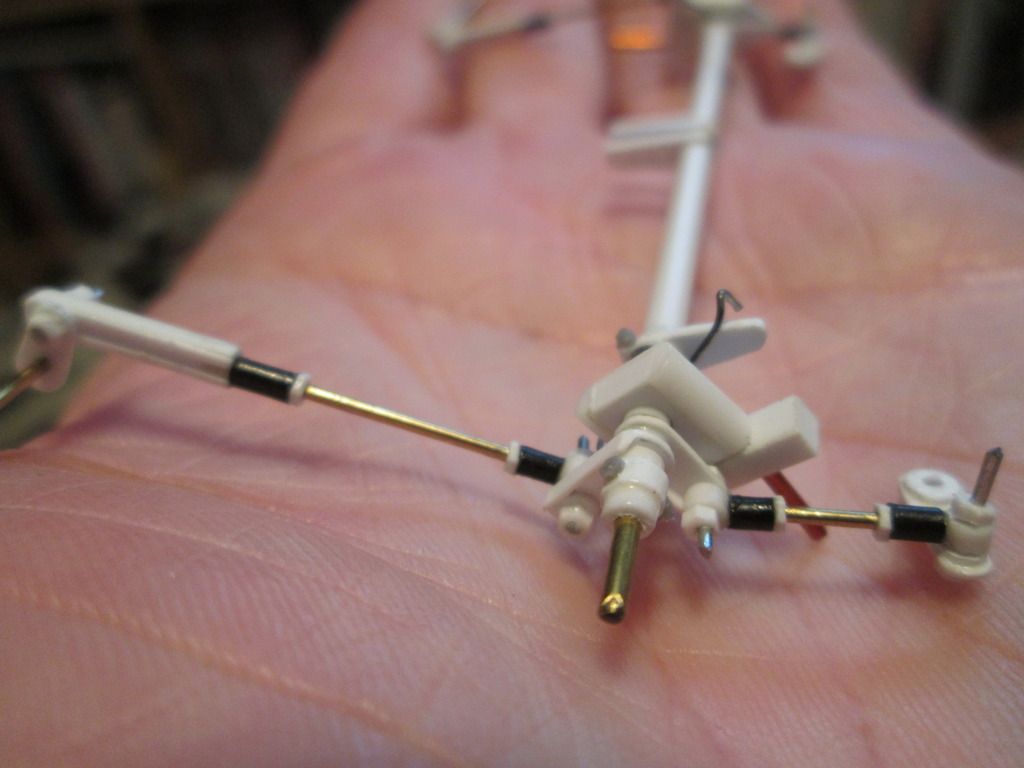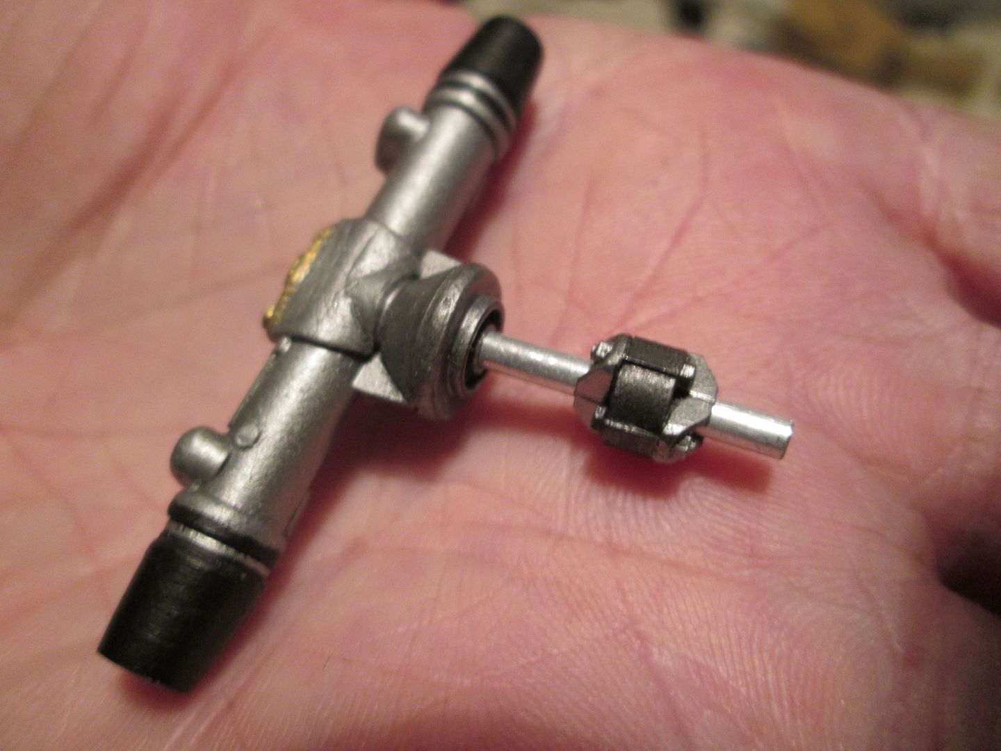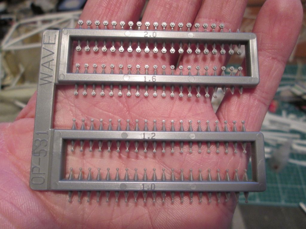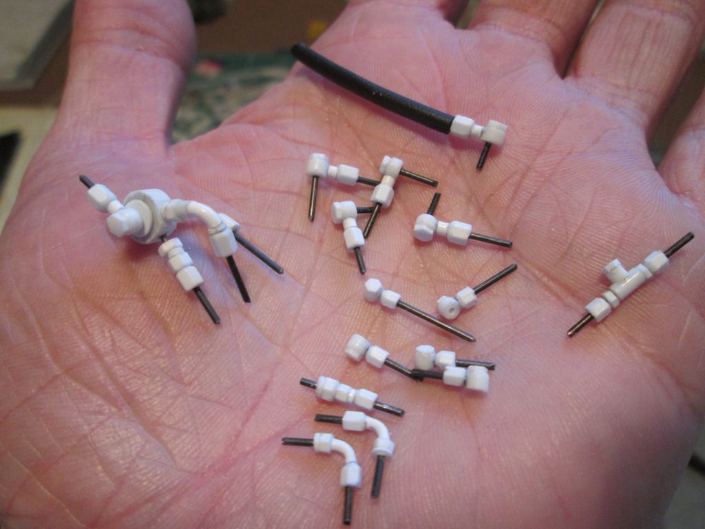 This is just a small selection. They're a mixture of 2mm and 2.5mm hex, plus various bits of round, tube, punched discs, etc. Given that each fitting might have four or five individual parts, and there are at least fourteen hoses each with two fittings, the maths soon starts to add up. Somewhere in excess of 100 individual components to be cut, drilled, filed and glued together...which is why it took nearly two weeks!