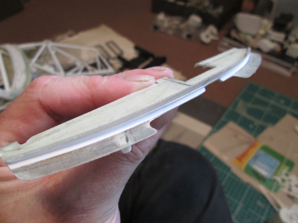 You can also see two L-shaped pieces of styrene added either side of the steering column - I'm scouring all my reference photos to find little features like this which will liven-up the fibreglass panels. The two T-shaped details are the starting point for some filler-work. Finally for this photo, I've added a styrene lip around the channel for the steering column - two layers of 0.4mm strip.