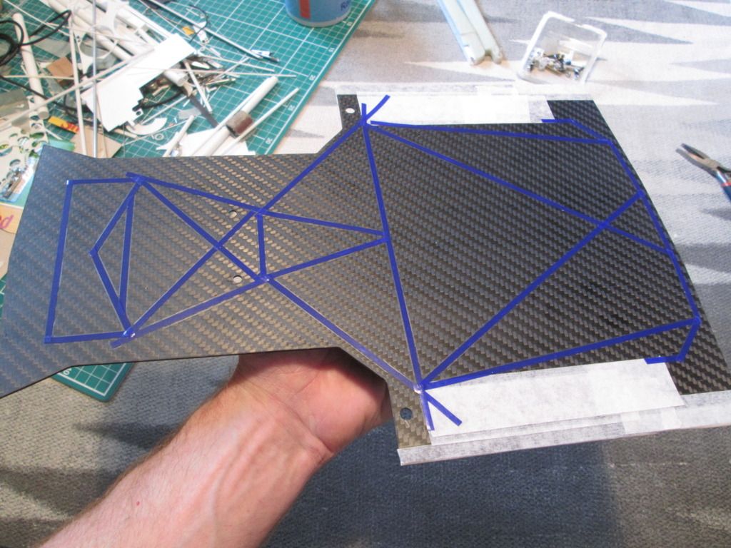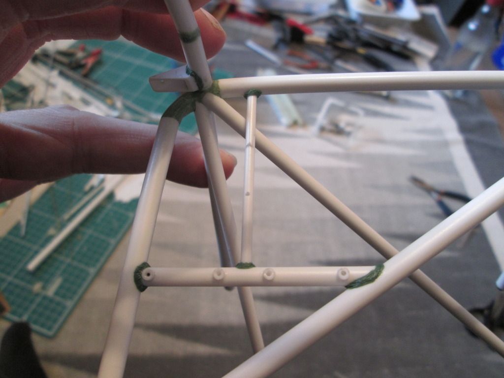 Finally, the frame has been glued to the floor. Despite painting both parts last month, I've been reluctant to put them together for fear of messing things up. However, the need to make progress has won, so this was the project for Saturday evening. I couldn't use CA glue over the whole frame then fix it down in one hit - it would have gone off before I finished putting it on! So, I used 'Uhu' on the inner sill tubes, then a little CA at the front, then put it together using the outer sill sections to get everything in the right place (using the little aluminium dowels described a while ago). I've then run-in more CA glue into the gaps between the tubes and the floor, so most of the main lower tubes now have two seams of glue bonding them to the carbon. The extra bits of fibreglass 'strapping' will be added later as reinforcement.
