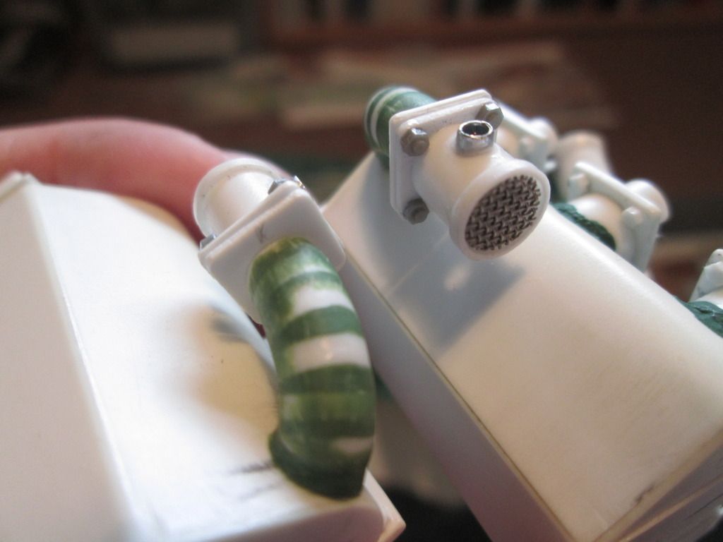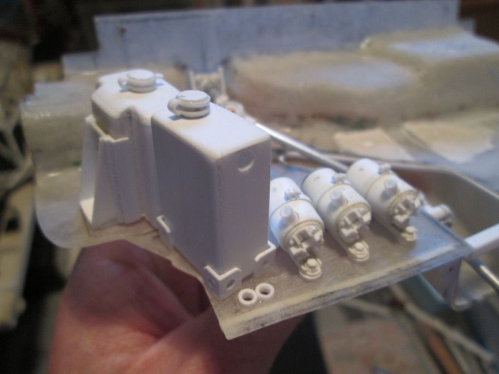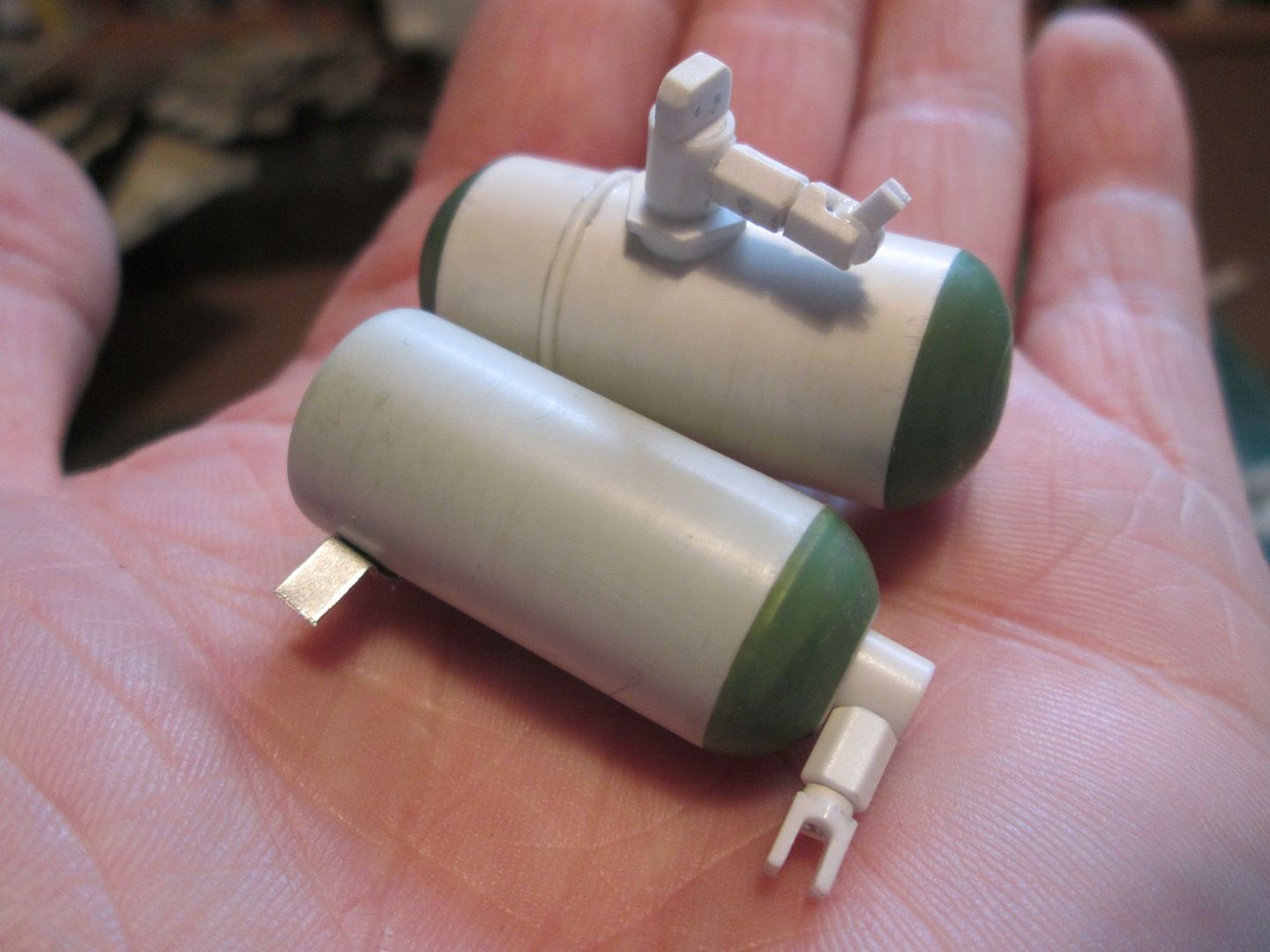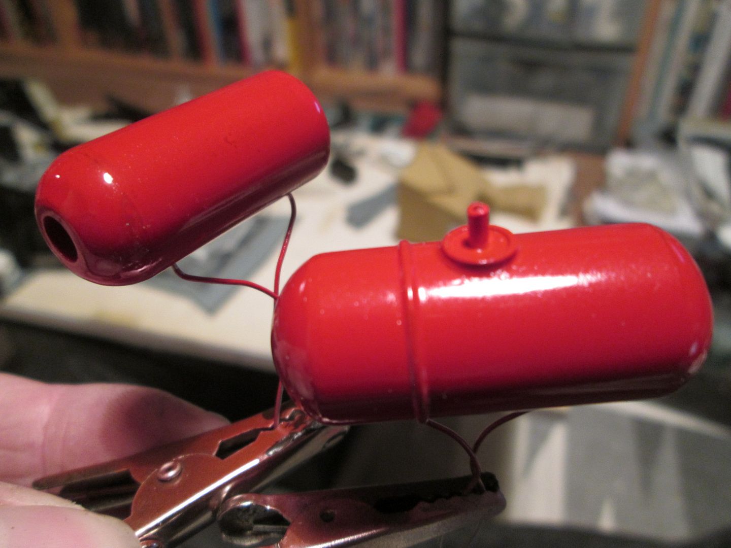 The two fire extinguisher bottles were airbushed with Tamiya orange over a grey primer, then a couple of coats of red. The firing heads, etc, will be painted soon.