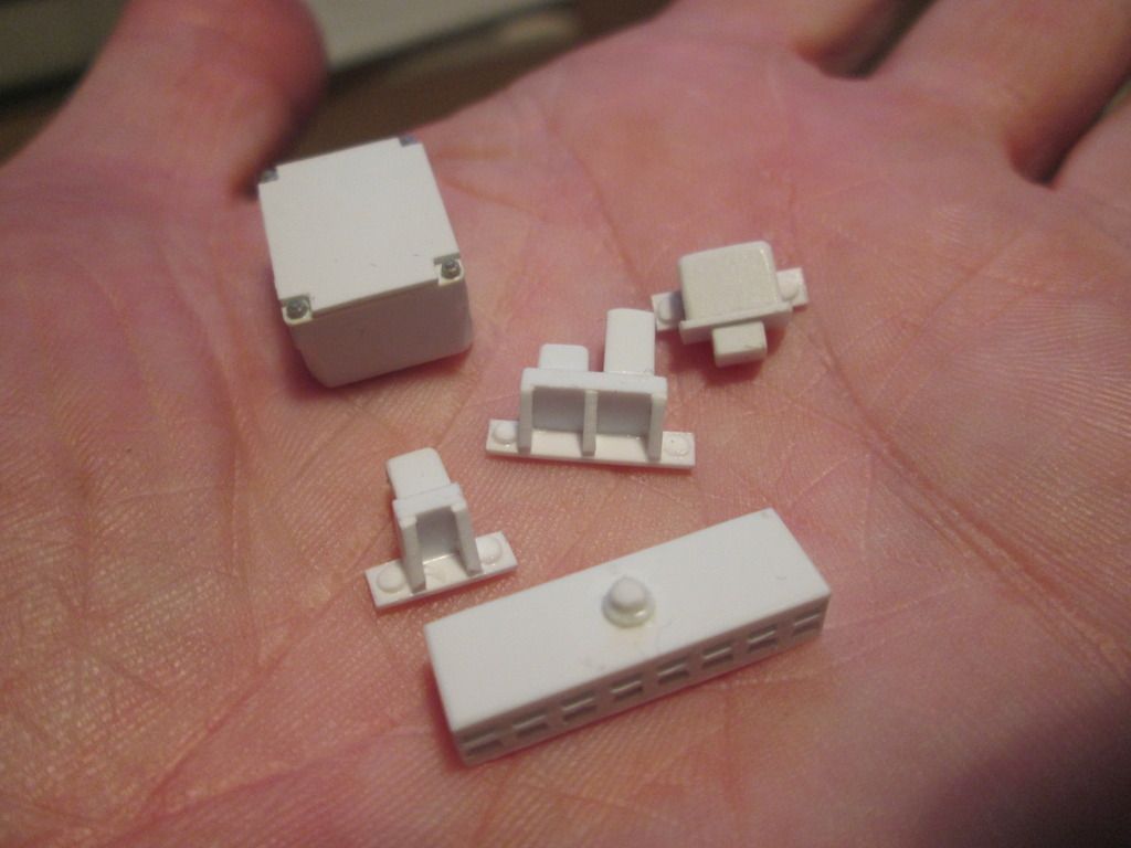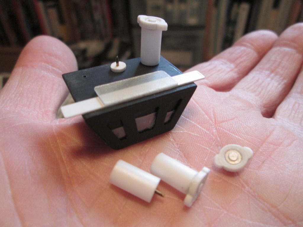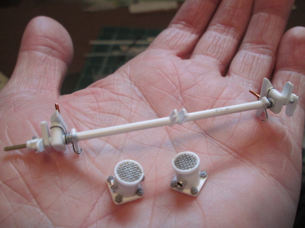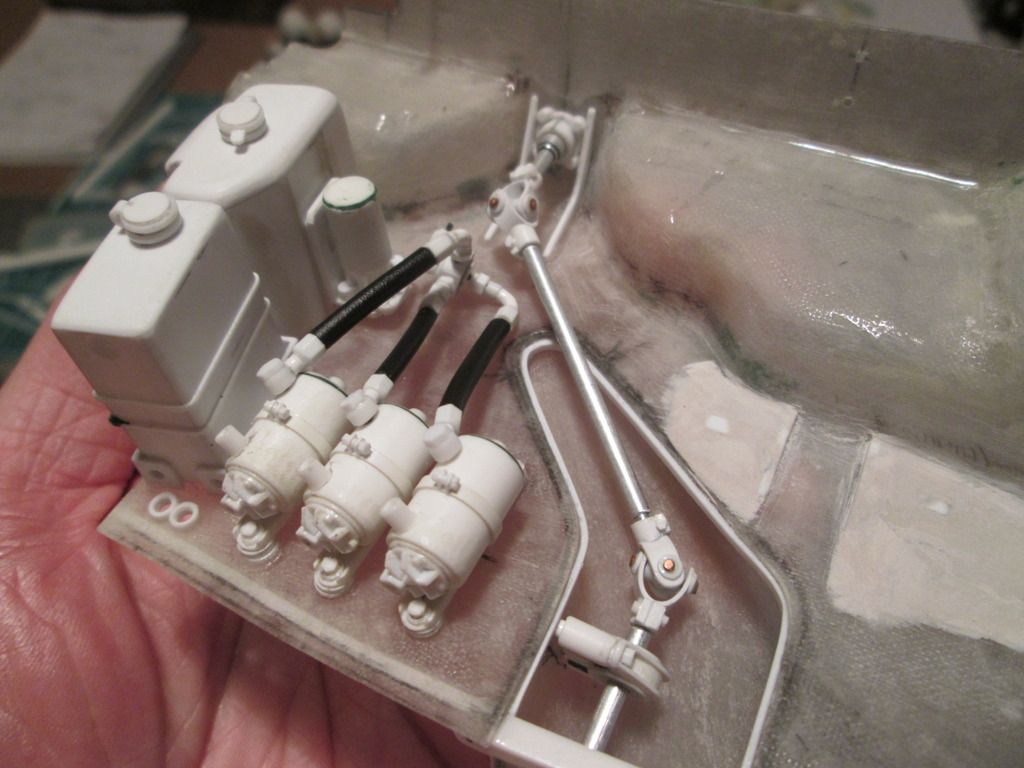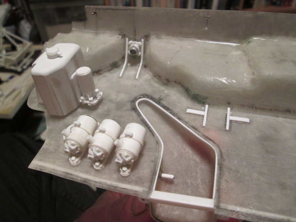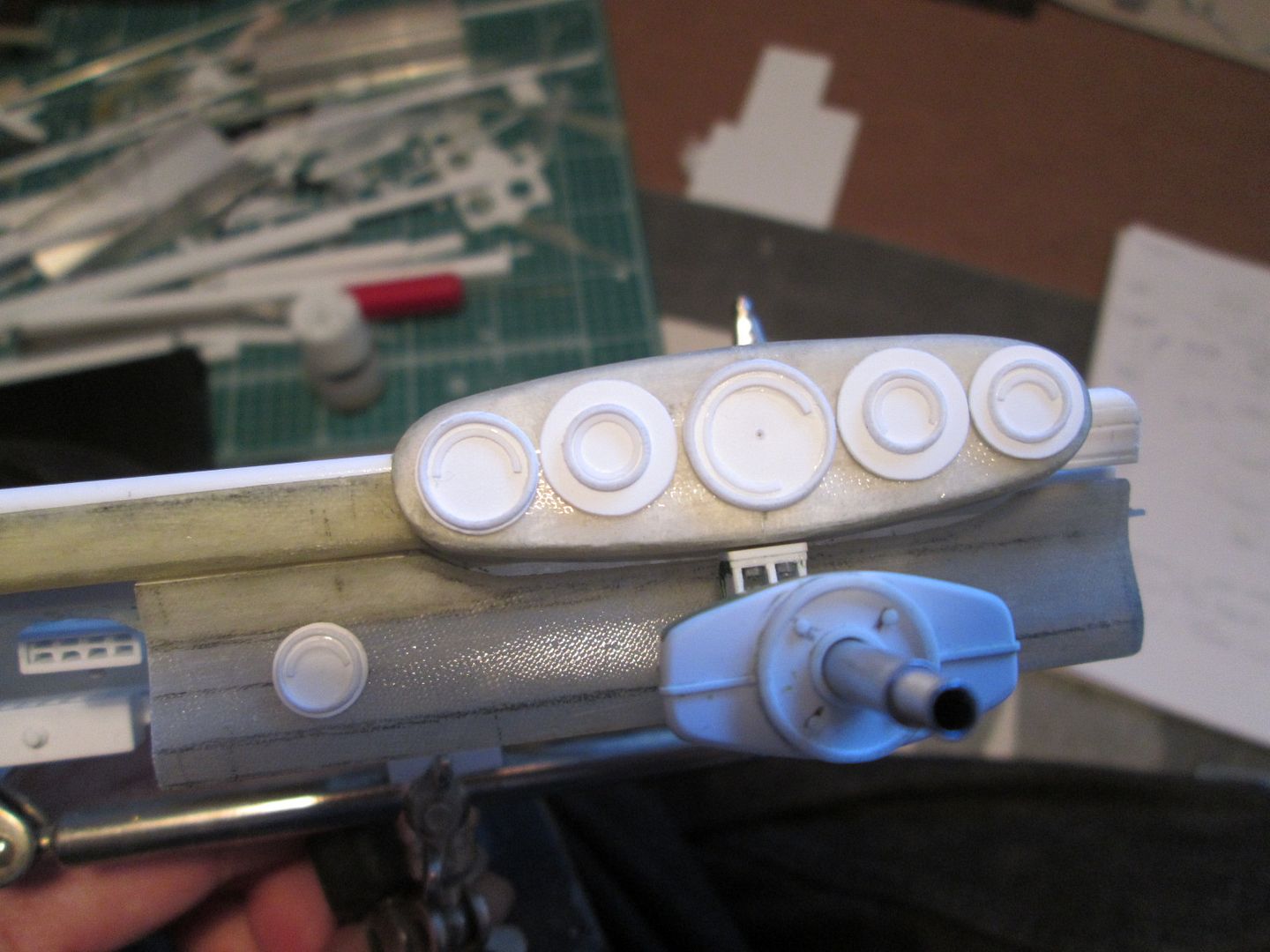 The two fire extinguisher bottles were airbushed with Tamiya orange over a grey primer, then a couple of coats of red. The firing heads, etc, will be painted soon.
