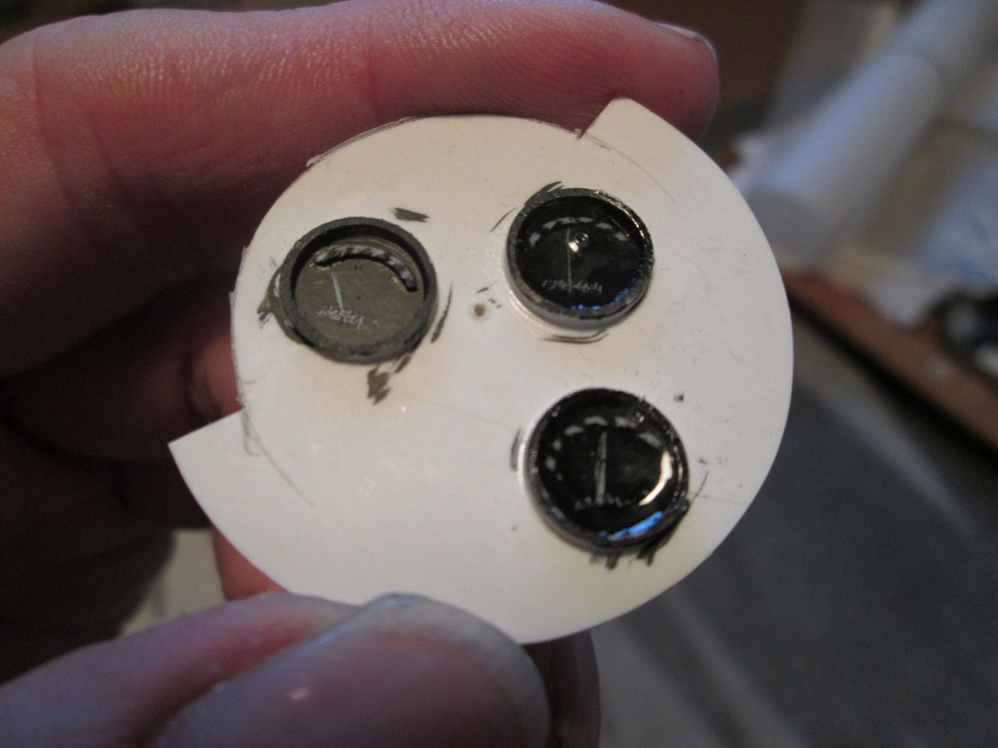 Instead of cutting clear plastic discs to fit into the gauges, I decided to try something different. I bought a bottle of Vallejo 'Water Texture' and made some test gauges to try it out: