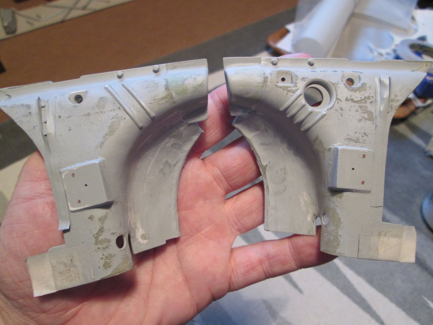 As usual, they looked a bit rough after the first coat so needed a little more flatting and smoothing. The weld detailing around the airjack supports needs a little work to make it more noticeable, I think, so I'll do that before the next primer coat.