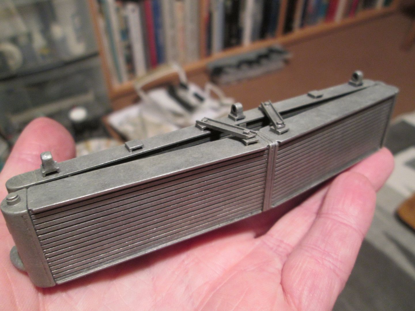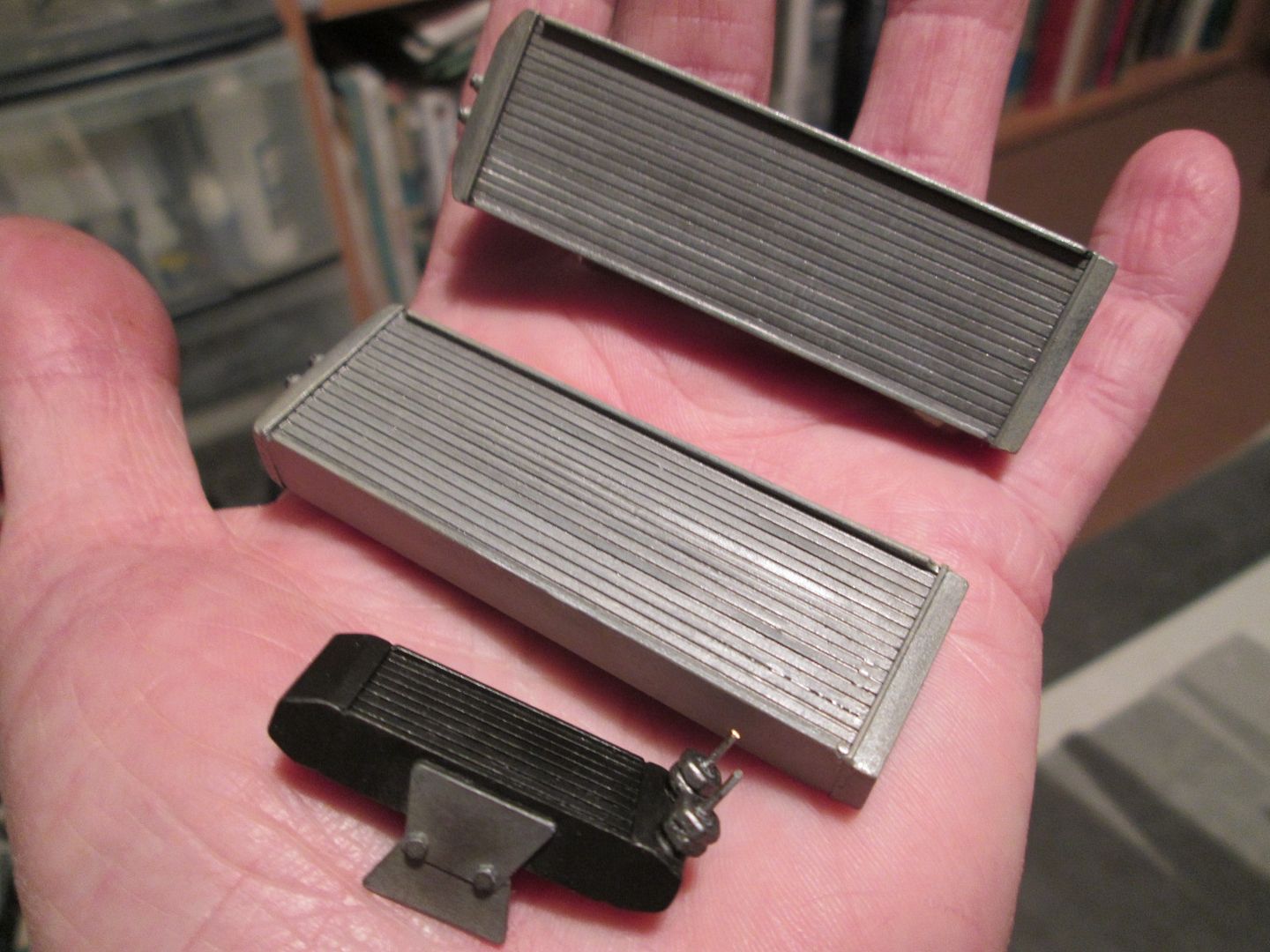 First up, here's the side radiators and small gearbox oil cooler, and the main oil and water rads from the front. These have been hand-painted over an aerosol grey primer base, working up through various greys and pale browns, with a couple of silvers thrown in to get a little metallic shine in places. The gearbox cooler is basic black, with a light drybrush to pick up some highlights.