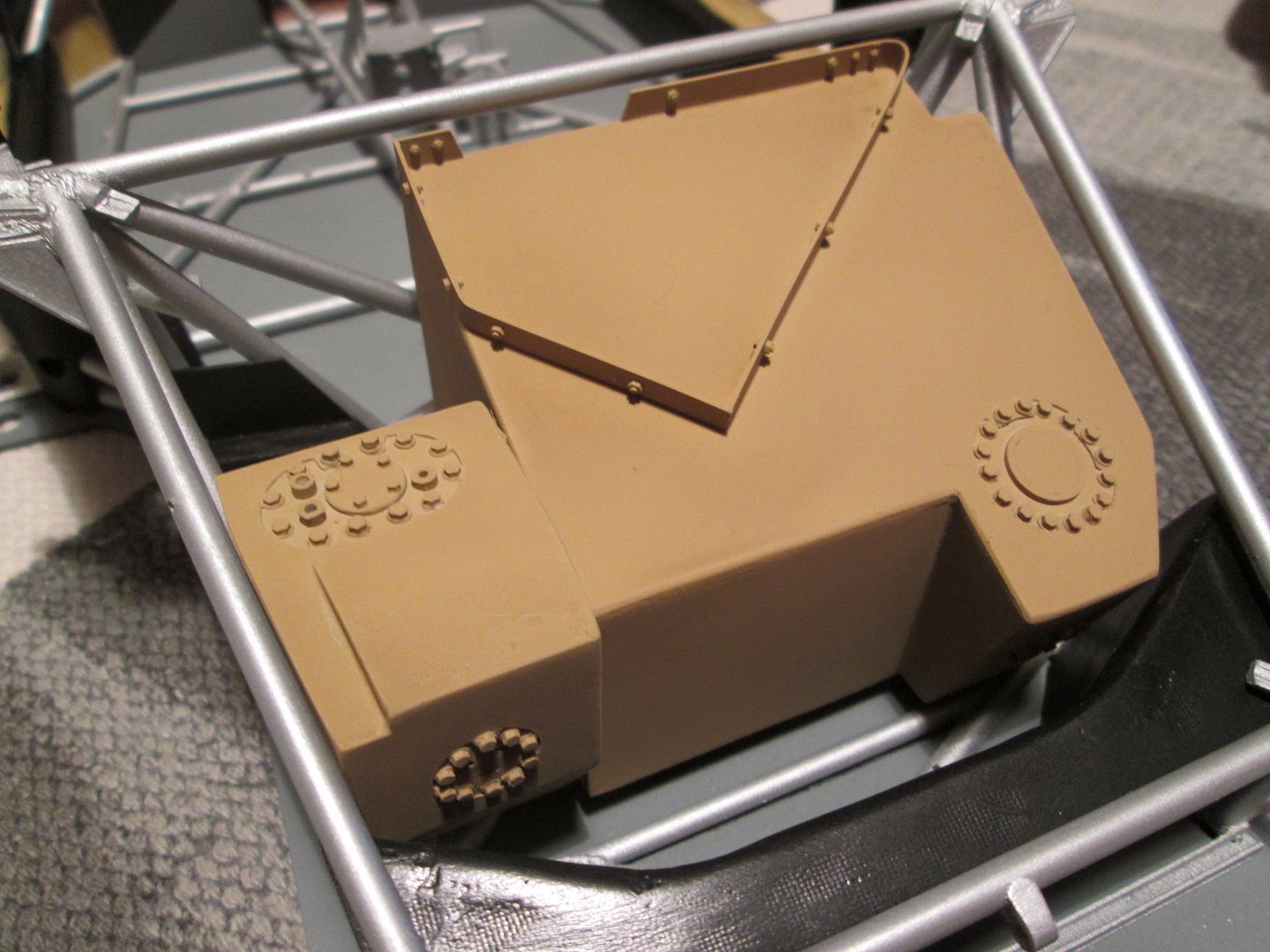 Most of the work in the last couple of weeks has been painting, with occasional outbreaks of gluing. The short-term plan is still to get everything ready for fitting the front bulkhead and firewall, but only being able to airbrush at the weekends has required a change of focus.