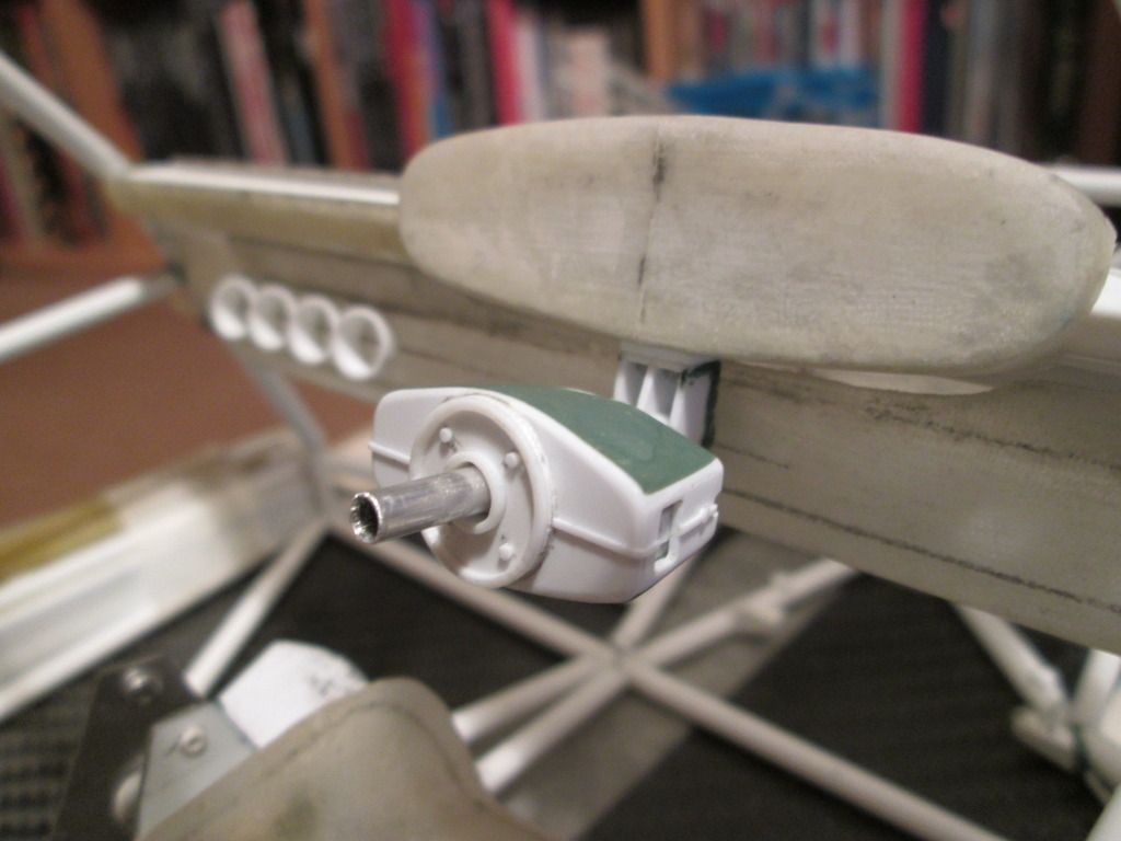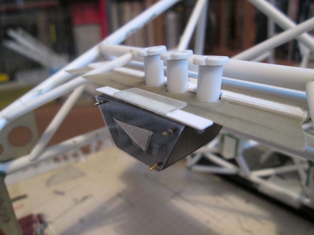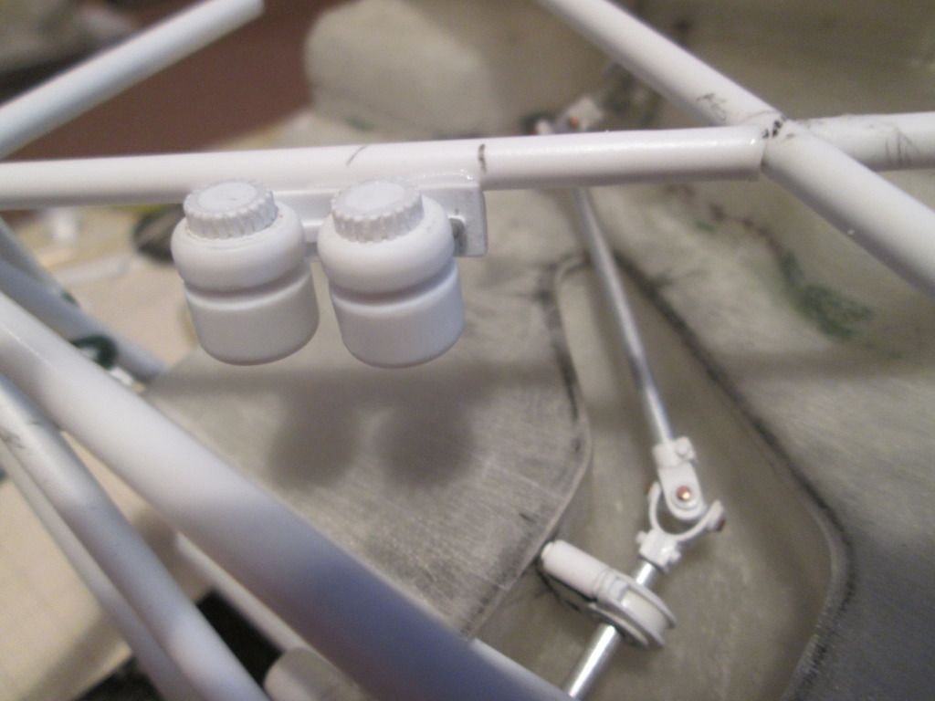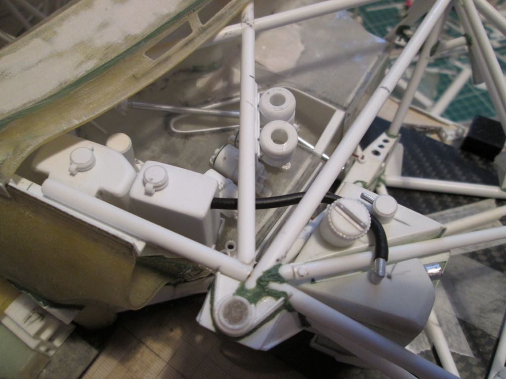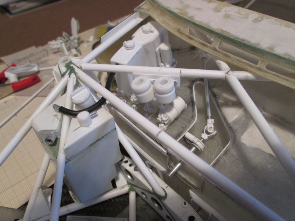 The two pull-cables will pass through the top of the upright section in the rear bottle, connect to the lever on the end, then continue to a similar lever on the second bottle. One pull-cable in the cockpit, one between the windscreen and the bonnet - pull either and you set off both bottles. I've still got to make the cables, add the extinguisher pipework, and sort out how I'm going to make decals for the labels.