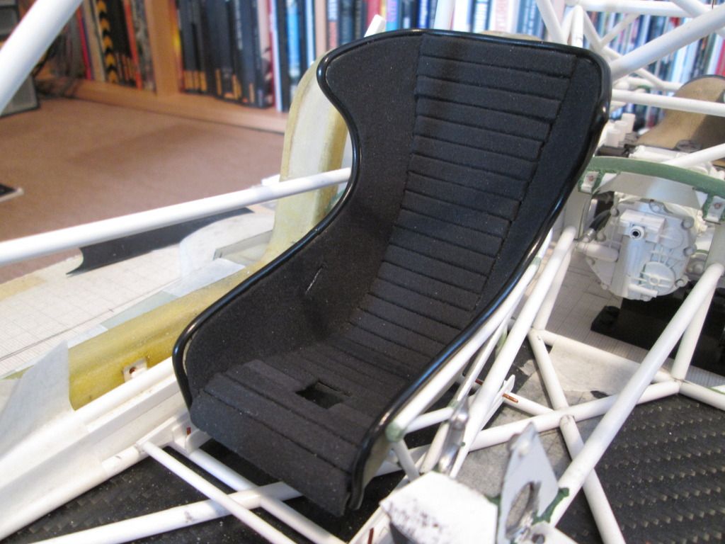 It may not be totally accurate to the original factory car (which appears to have had a plain seat covering) but the rebuilt Freisinger car has this type of padding - and, to my eyes, it's more visually interesting. Once it's got the seatbelts draped over it, it'll be spot-on.