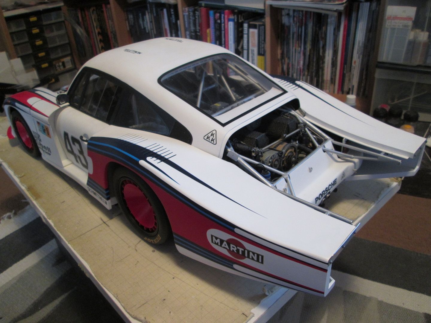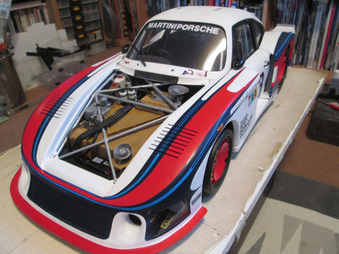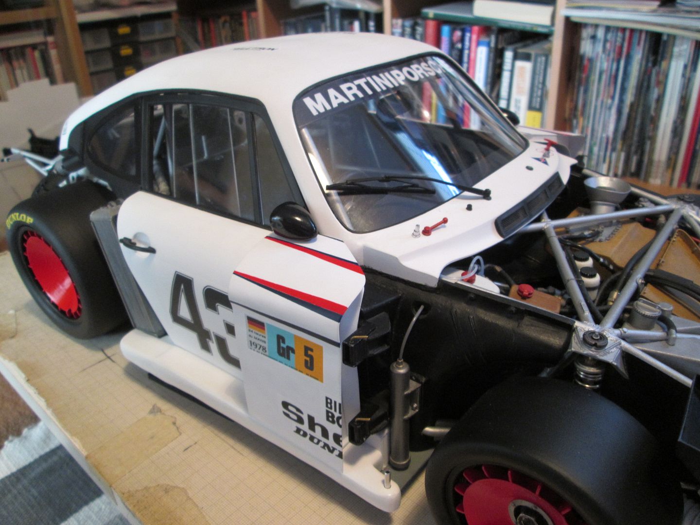 For now it's sitting on an empty desk, but I suspect it'll end up in the dining room - many of our family and friends know about my model-making, and most of them have seen the 935 at various stages of it's life, so it's probably safer to have it on display downstairs for a while. I'll have to show the guys at work too, as they know all about it - several of them have full-size project cars on the go, so we're often discussing the same problems but in different scales!