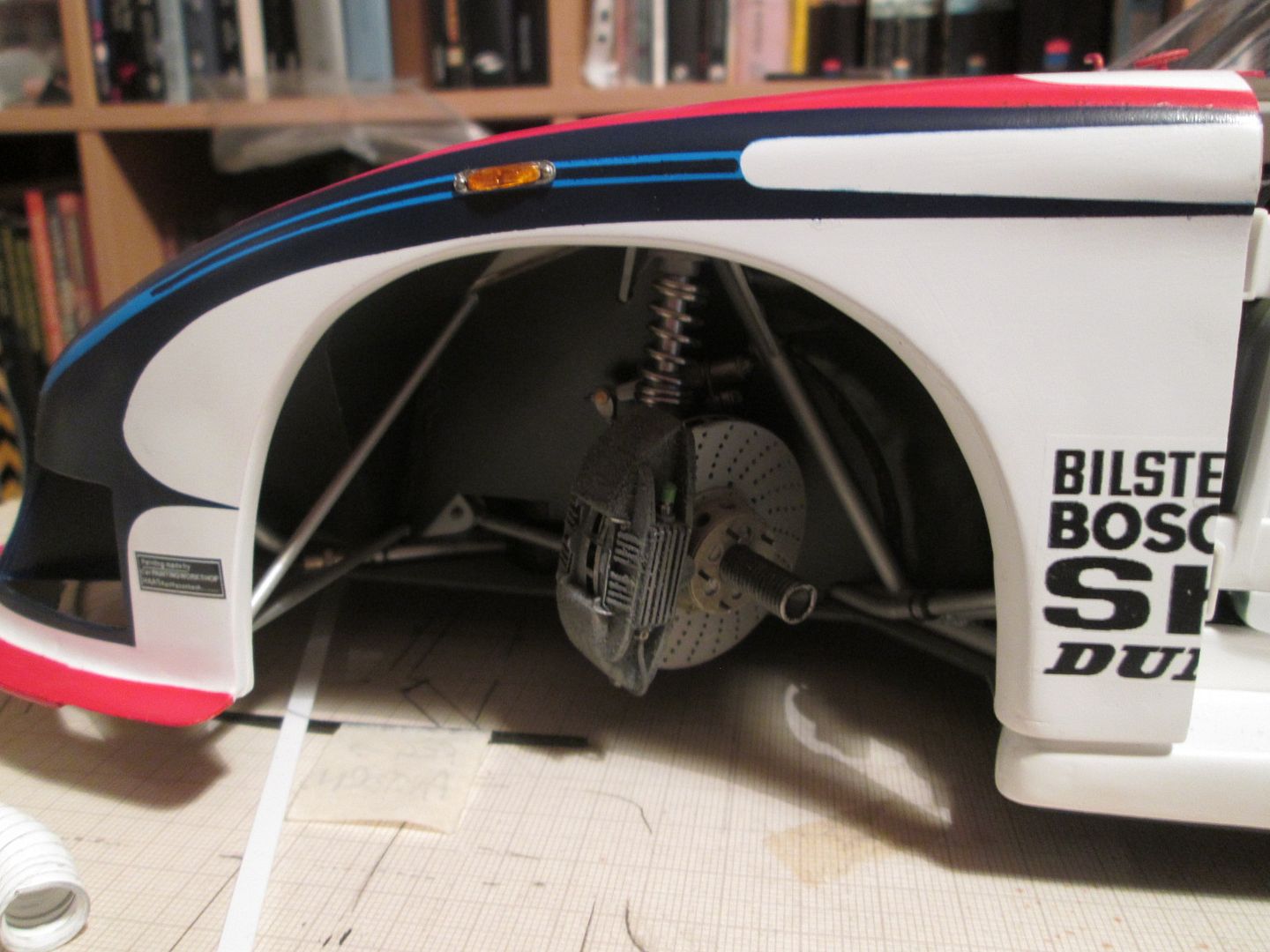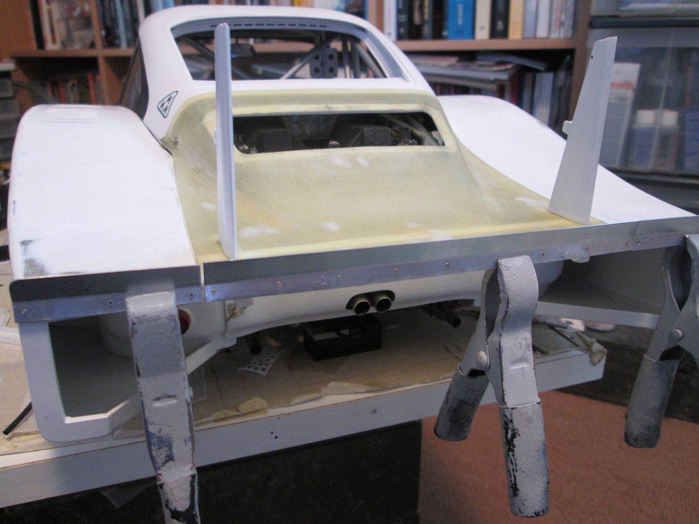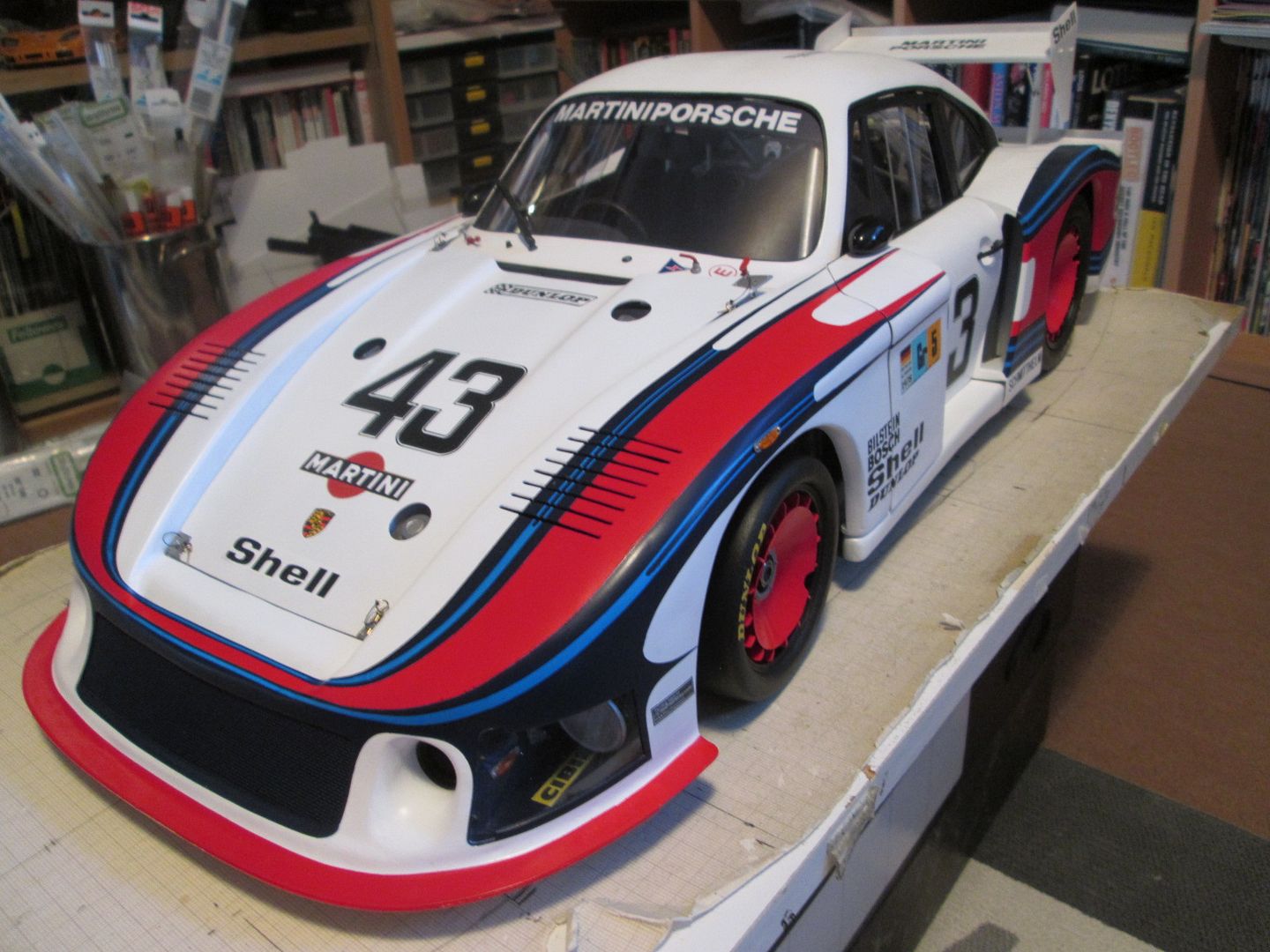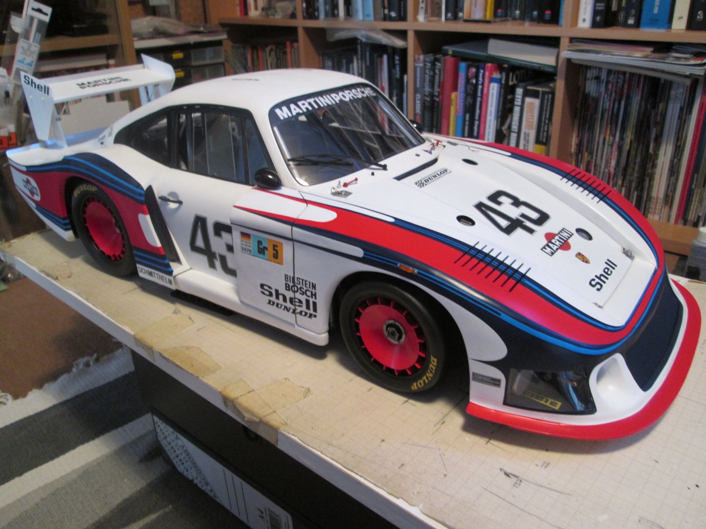 For now it's sitting on an empty desk, but I suspect it'll end up in the dining room - many of our family and friends know about my model-making, and most of them have seen the 935 at various stages of it's life, so it's probably safer to have it on display downstairs for a while. I'll have to show the guys at work too, as they know all about it - several of them have full-size project cars on the go, so we're often discussing the same problems but in different scales!