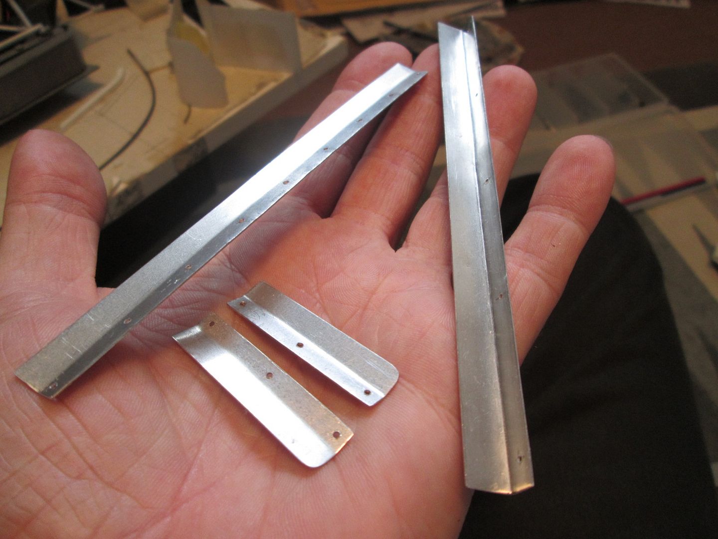 The trim tabs on the back edge are made from 0.016" aluminium. I spent several hours working on these - straightening out the ali after cutting, marking and drilling the holes, getting them bent to shape, etc. Styrene would have been easier in some respects, but it would have been difficult to get the bends, and they would have needed painting afterwards. In ali, they just need to be glued and pinned in place and that's it. While I was at it, I also made the gurney for the main wing: