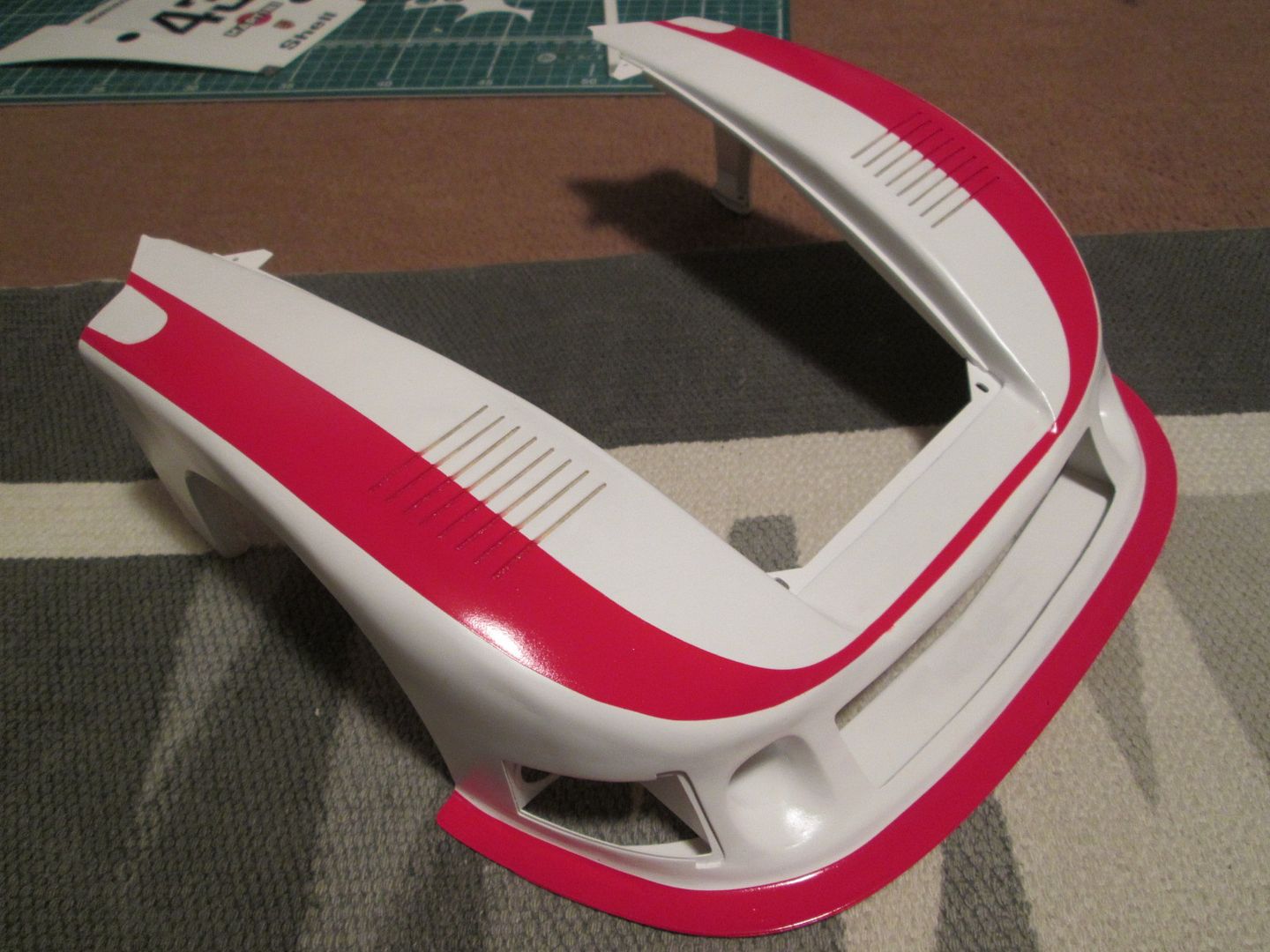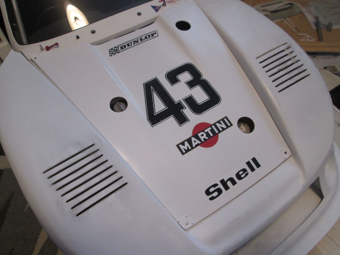 So, lots going on, and still more to do. I'll give all the decalled panels another coat of Purity Seal to seal them in, and then I can paint the inner faces, etc. Hopefully I can get the rear wing assembled this week and with the grill fitted that would be the engine cover finished.