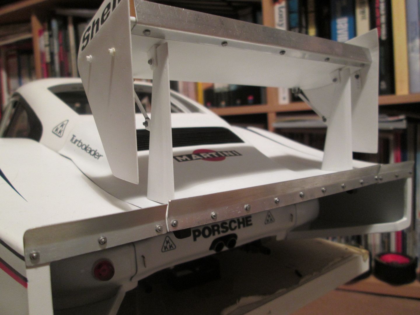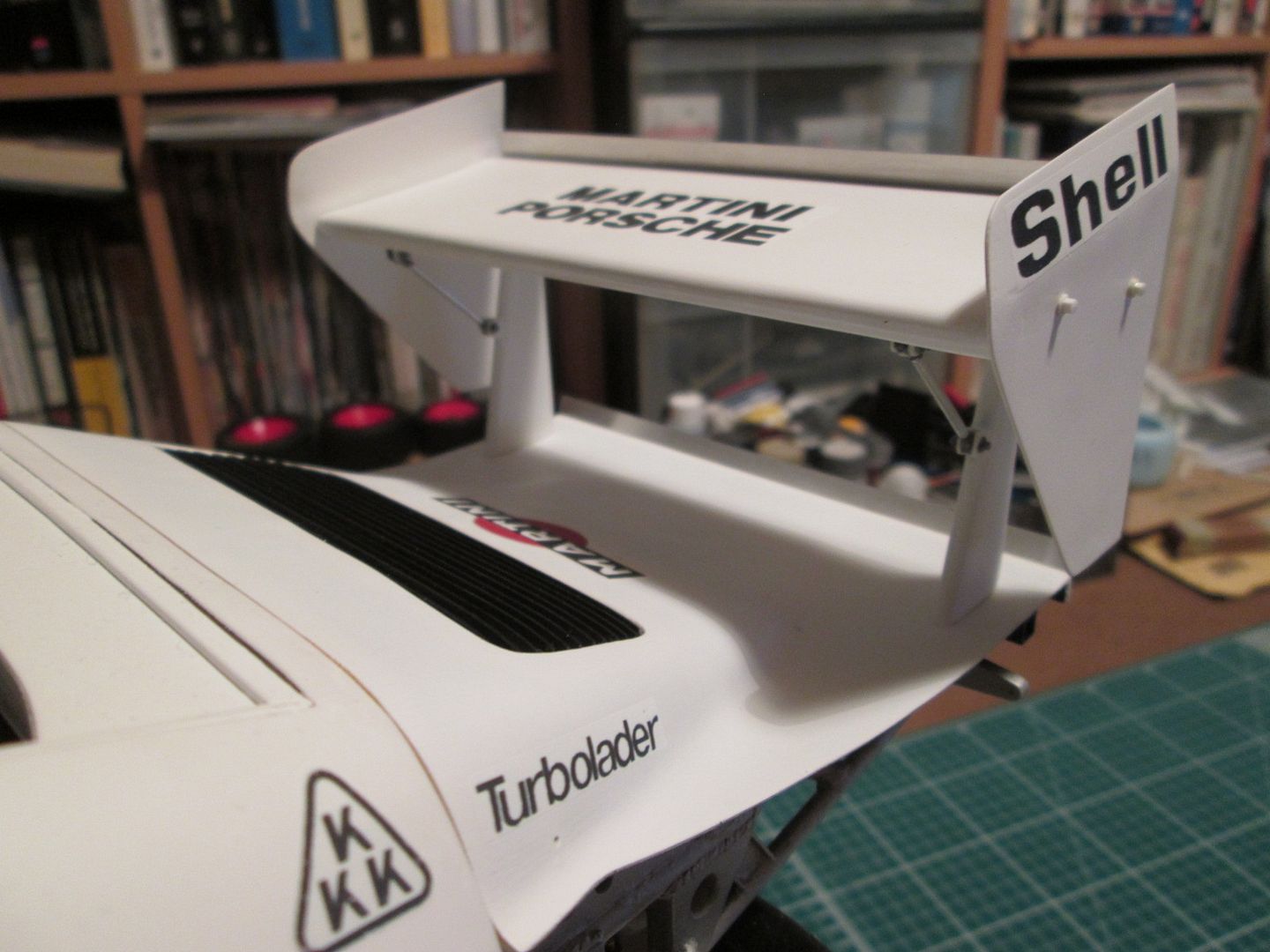 I've printed out some more versions of the small Porsche shield to fit between the 'Martini' and 'Shell' logos and will apply this later during the week - I just need to check some more photos to confirm the style. The engine cover is done, I've got the decals ready for the lower bumper, and the wing and end-plates are ready for assembly.