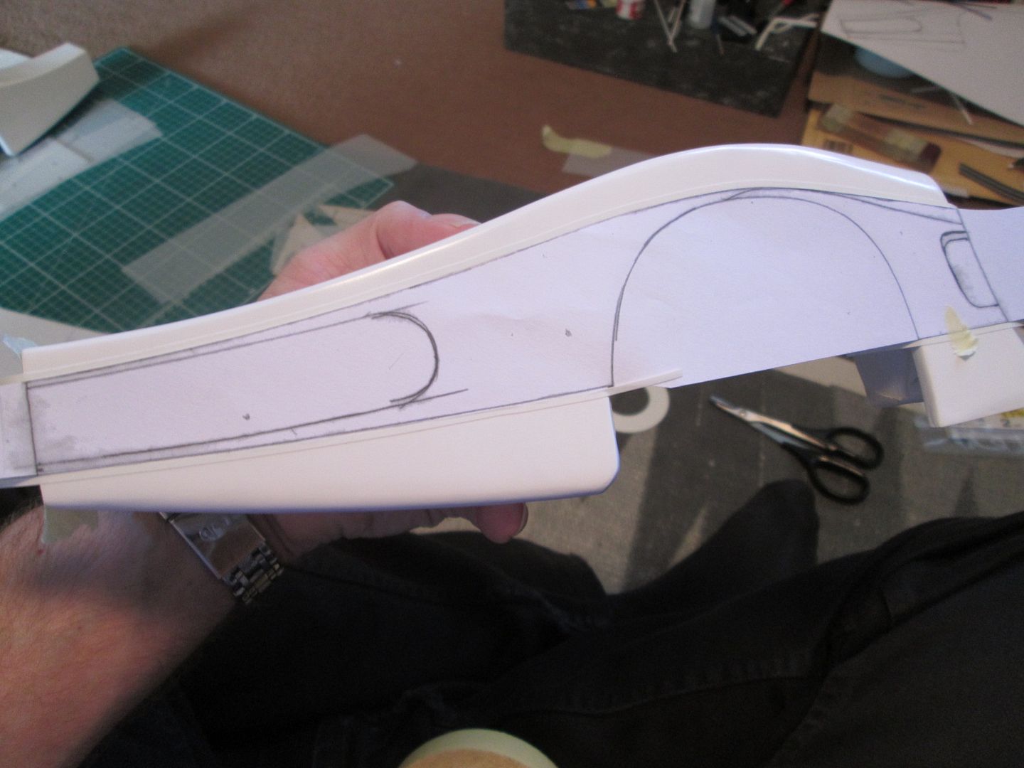 No, it's okay! I understand what you're saying - I've just taken some more photos tonight which are more of a match for the details you've indicated. If Photobucket performs, I'll try to post them up tomorrow. The current shape of the windscreen is actually different from how I first made it - you can see here how I extended the curve of the top edge, as I wasn't happy with the original: