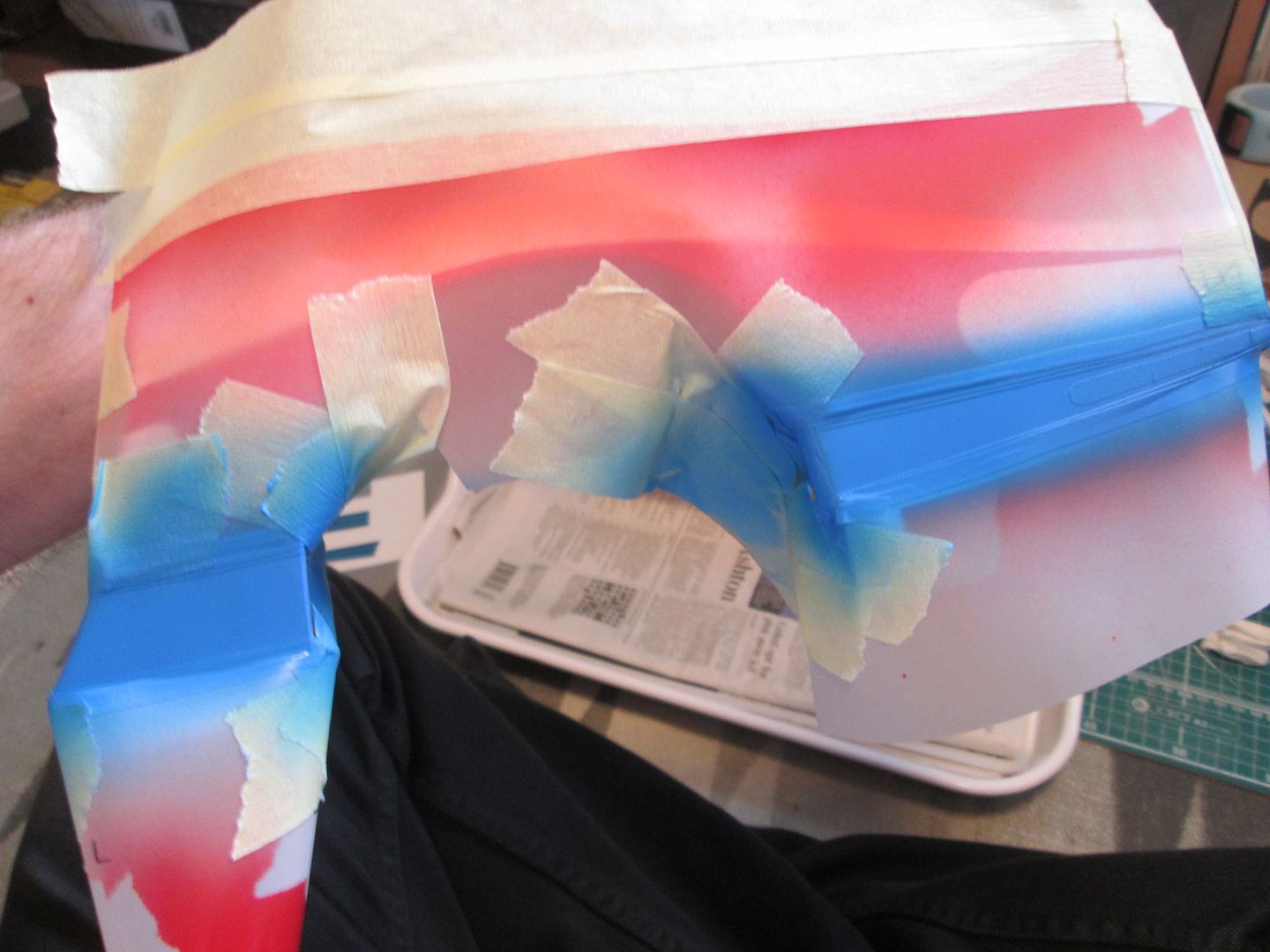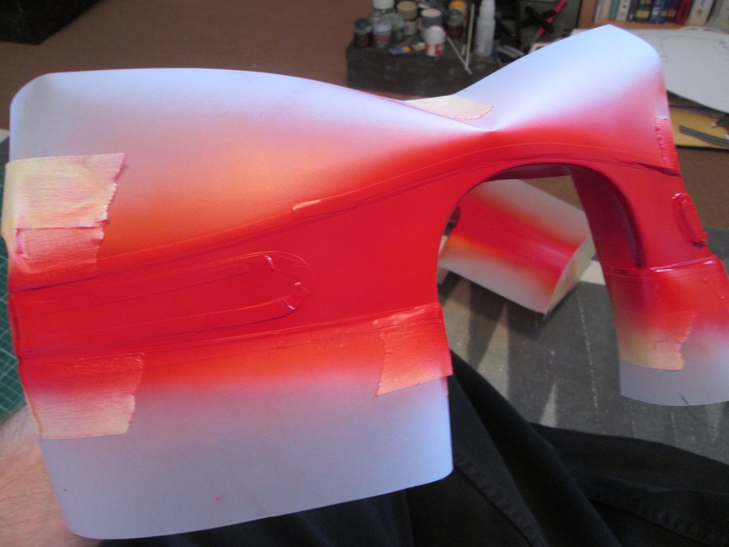 So, I started masking the first panel at about 10.00am yesterday, sprayed the first orange coat at about 11.30am, then started masking the second. By about 2.00pm I'd airbrushed both panels with the red and left them to dry. I didn't want to leave the masking on any longer than necessary, so by late afternoon I started to carefully remove it: