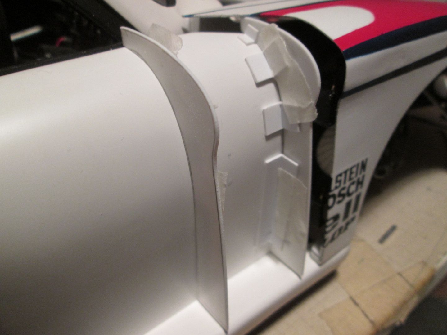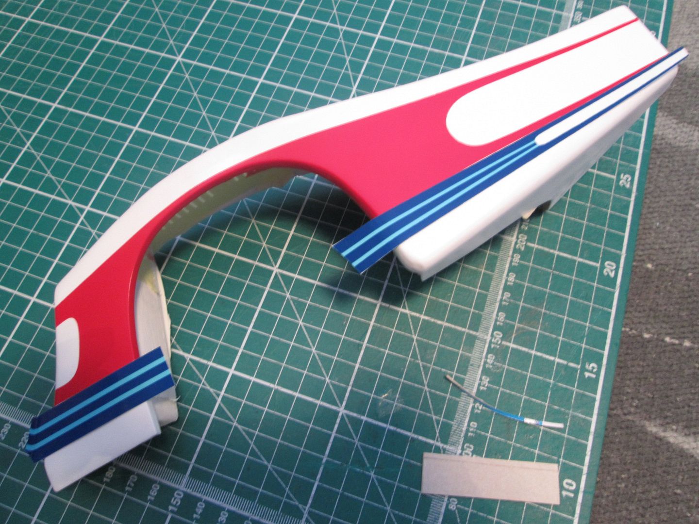 The main reason for updating tonight, though, is that I've had a successful week with the paintwork. As well as continuing to work on assembling the rear wing and engine cover, I've been working towards getting some stripes on the rear wheelarches. Plan A - mask and airbrush the red section, then add the blue stripes with decals.