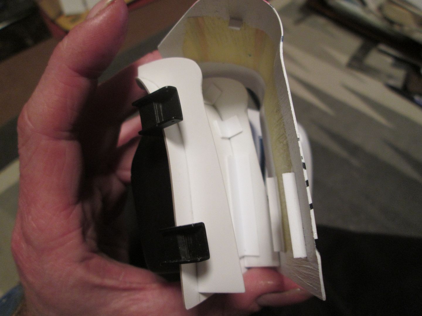 Here are the two photos that didn't upload properly last night. Here's the underside of the engine cover, with the length of 4.8mm box running across, the reinforcing plates where the wing posts connect, and the two mounting 'cups' which locate onto the ends of the chassis outrigger tubes. Once it's in place, it's quite secure - especially when I add a couple of body pins at the front corner.