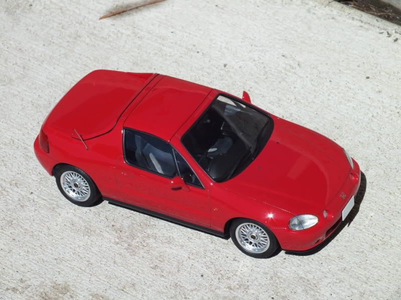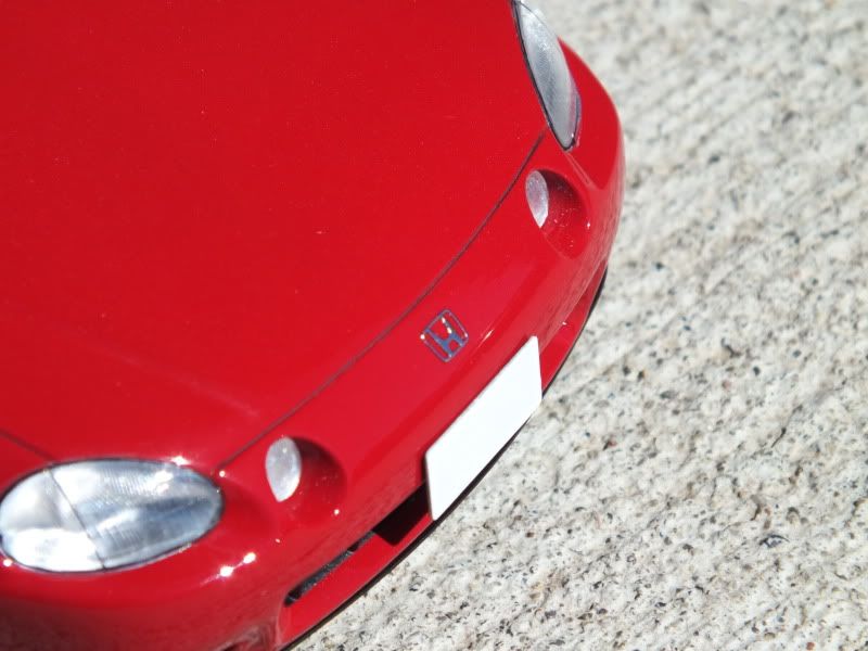 This is a very simple kit from Fujimi. Stock interior severely lack detail like many Fujimi kits of that age. At the moment I built this I had a 1:1 Del Sol sitting on the driveway so I can modify the interior based on what I see in the real thing. The inner panel of the roof is also done this way except to less detail. The lining also helped the roof locate itself when putting it back on. The spokes of the wheels were painted Tamiya XF-16 followed by Duplicolor clear, with the outer rims kept chrome and added valve stems. The front emblem is a leftover from Tamiya S2000 kit. A water-slide emblem from Hobby Design has been put on the back since these photos were taken, I finished this build at the beginning of past August I have just forgot to put pics up.