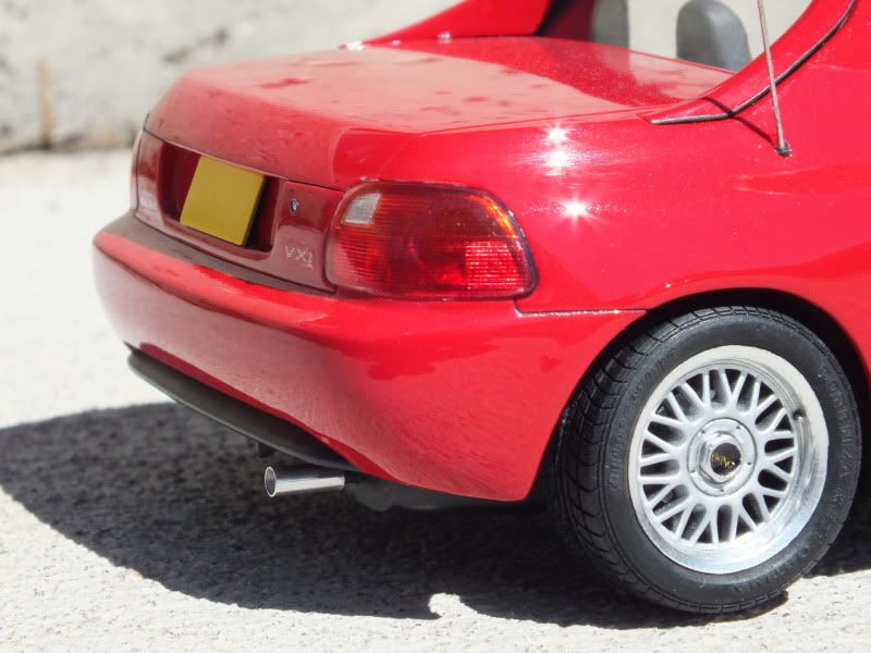Modifications: Roof lining, full interior, Aoshima Work Ewing 15" wheels, antenna, aluminum exhaust tip, suspension lowered 1.5mm, key holes replaced with paperclip steel rods.