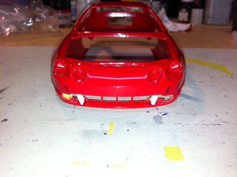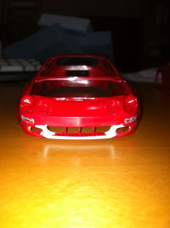 Bumper work has been started. The lower opening was cut more open toward the sides and vertical pieces glued on. Tamiya smooth putty is then used to fill the corners and voids. Shape of the turn signals have also been changed. Sadly the glue pegs are right behind the signals so I can't simply drill it open.