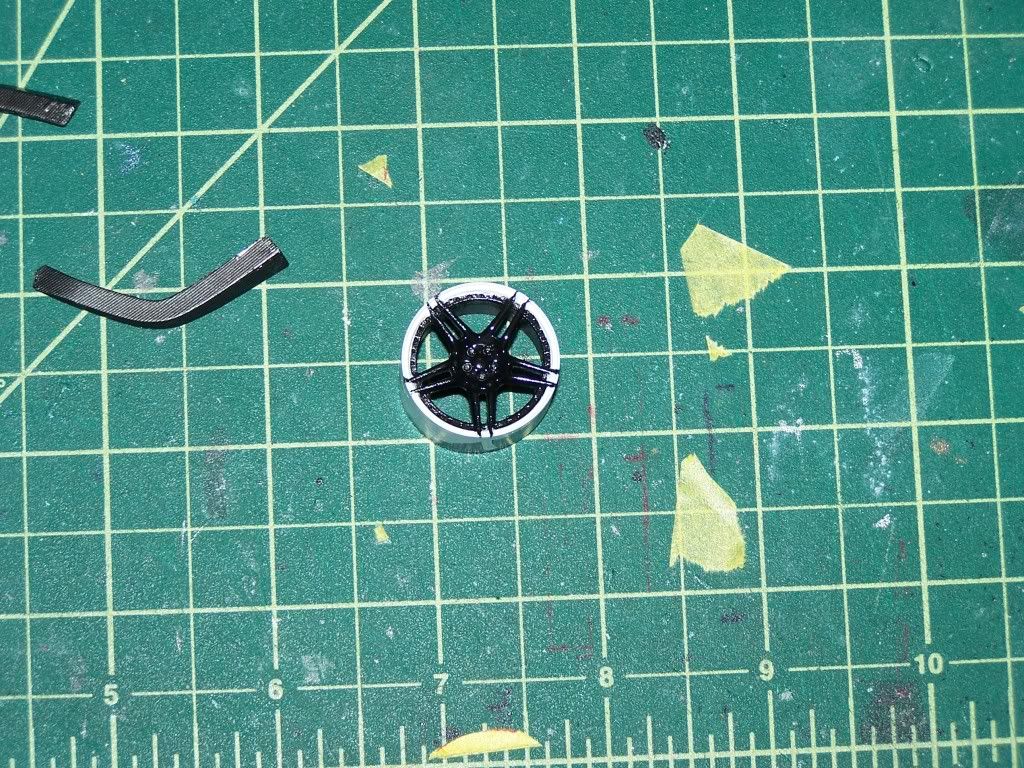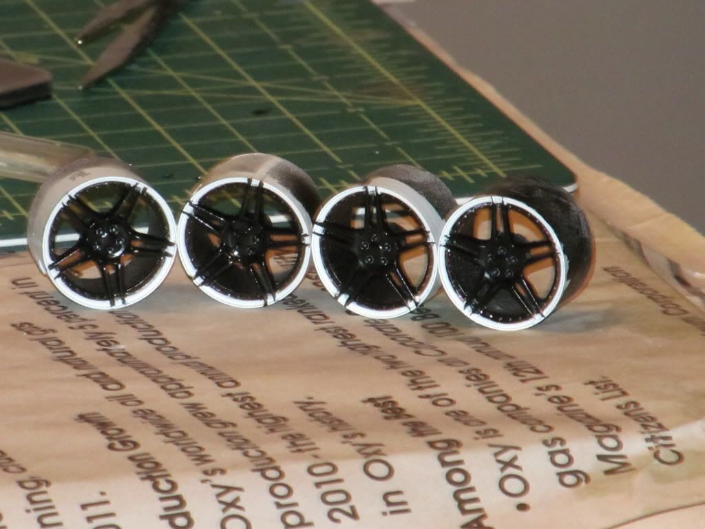 Working many hours lately not much progress.Just did one wheel. One hour to mask 3 min to paint..sheesh.Still need a touch up or two!!
