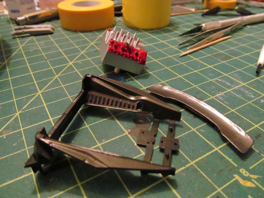 Not much interest but oh well....Did some carbon today and some clear glossing...airbox??.....louvers...rear spoiler...also started engine painting and assmbly