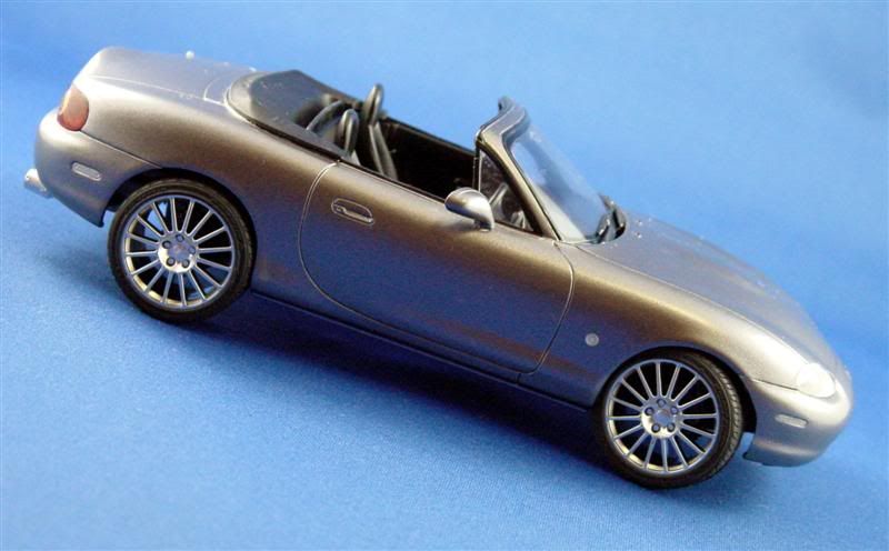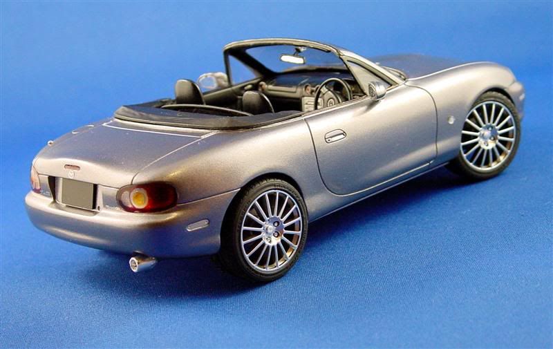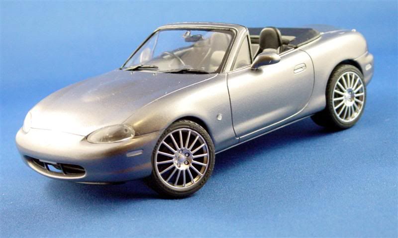 Here is an Aoshima Mazda MX-5 NB Series. Paint is Tamiya TS-42 Light Gun Metal, to replicate our own NB. Wheels are Fujimi, but I can't recall exactly what they are. Metal transfer badges from Crazy Modeller.