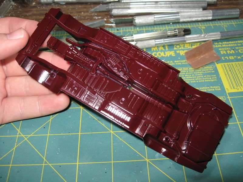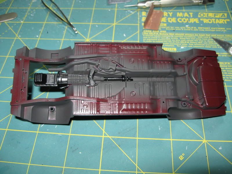 Getting work done on this, sprayed the chassis with Model Master Aircraft Interior Black. Oil pan, driveshaft and bell housing paint Model Master Semi-Gloss Black.