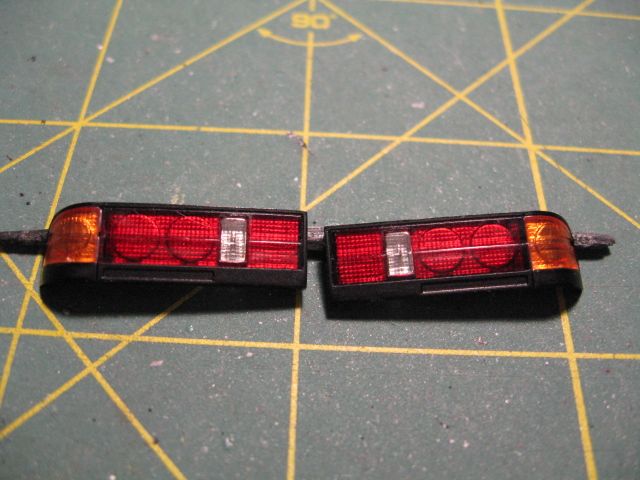 The tail lights are a multi-piece affair, each piece is molded in clear, clear orange and clear red. I applied BMF to the back and assembled with Elmer's white glue.