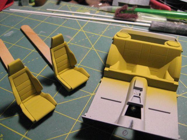 Seat inserts and part of the door panels in Tamiya XF-4 yellow green, rest of the interior will be in dark and German grey.