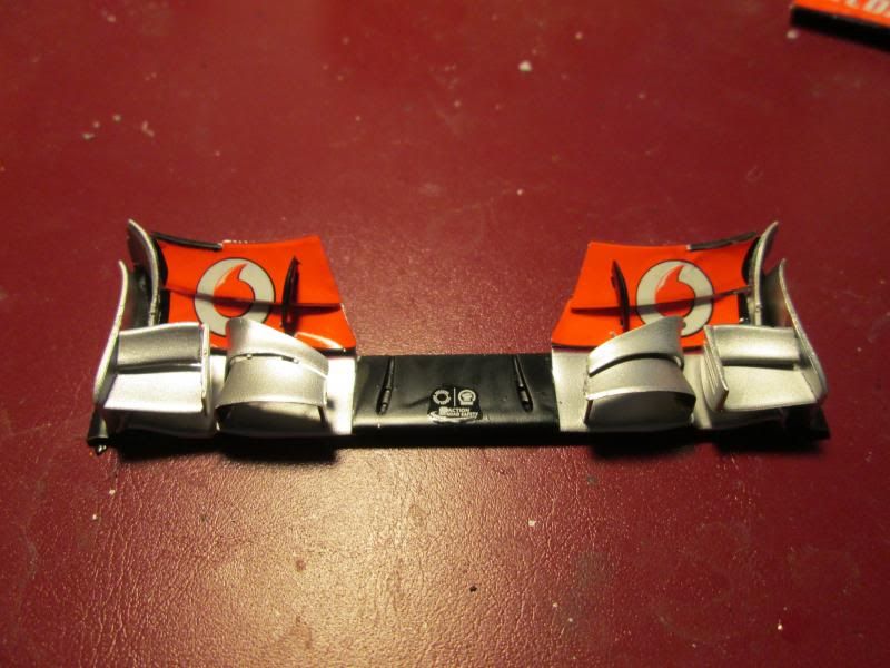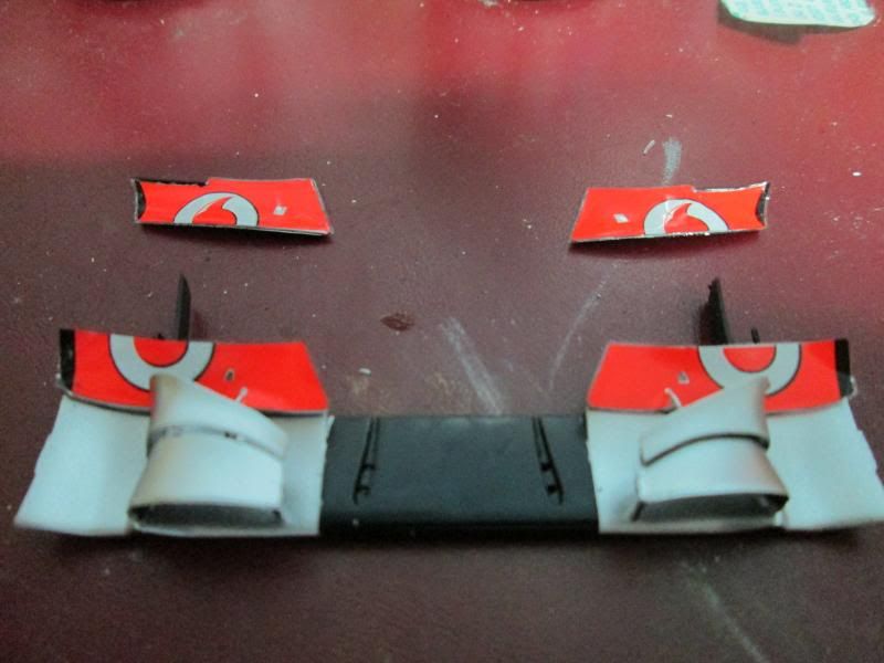 This takes me a while to paint underneath parts with X-18 & trying to attach the side of the front wing with the main part & somehow I managed to get it stick. I've placed the Vodafone logo prior to the attachment like the photos above.