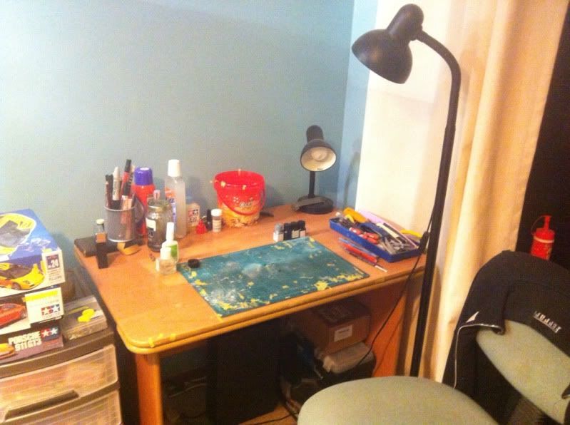 As for me I have a little corner in my wife and I's bedroom, I have my spraybooth stored in a closet, my stinky paints stored with my spray cans and my "drying box" in another closet. So I do the best I can with what I have. I don't have a pic right now of my corner, I'll try to post one in a few days because I have some tools coming still.