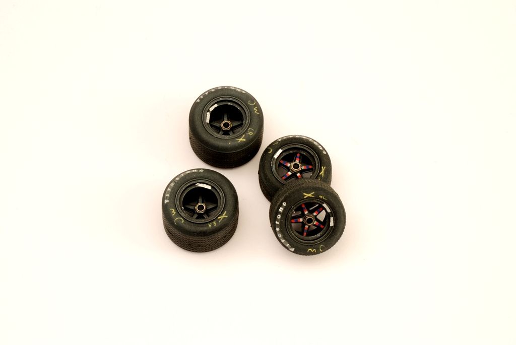 The wheels are finished seperately and are ready for fixation (via screws), these white-blue-red markings (John Wyer Team) are handpainted with pastel chalks instead of using the decals. The yellow marks on the sides are handpainted also refering pics in the Joe Honda book depending the 917 (VEEERY useful indeed!!!)